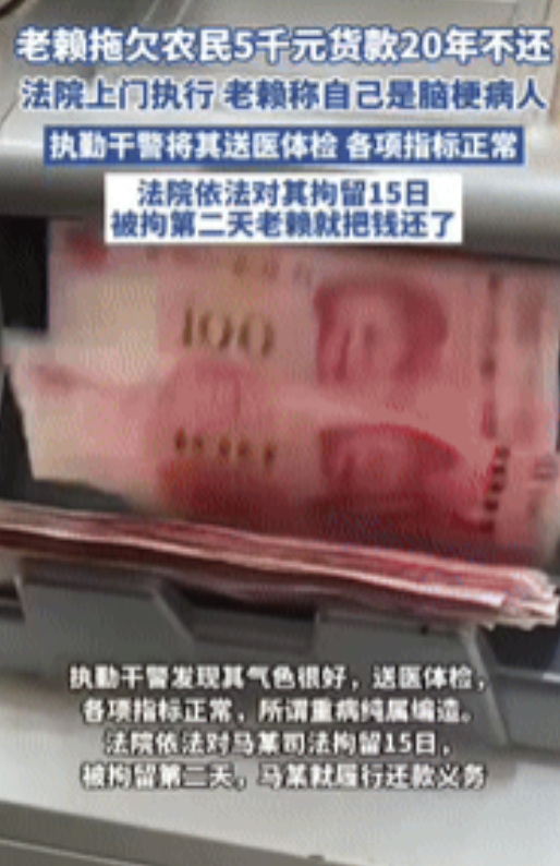 当“老赖”遇上法律,往往会催生出令人啼笑皆非的戏码。7月14日,在江苏,一起拖欠农民64000多元稻谷款中区区5000余元尾款的事件,最终以欠款男子“脑梗”发作、被拘留后秒速还清告终。这出令人“缺德冒烟”的闹剧,不仅揭示了部分“老赖”的无耻嘴脸,更再次证明了:在法律面前,任何花招都是徒劳,欠下的血汗钱,法院必然会让你“如数奉还”!