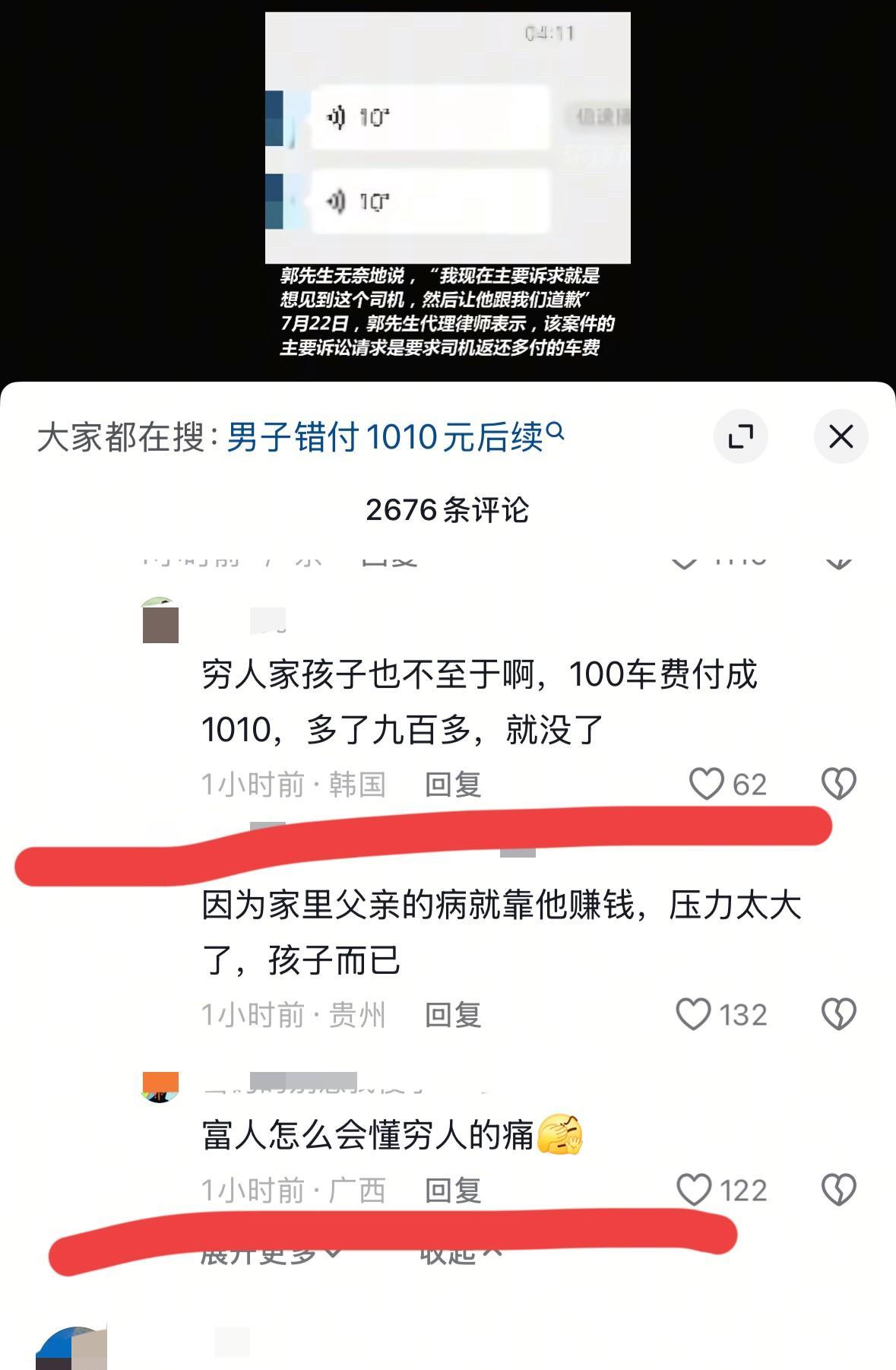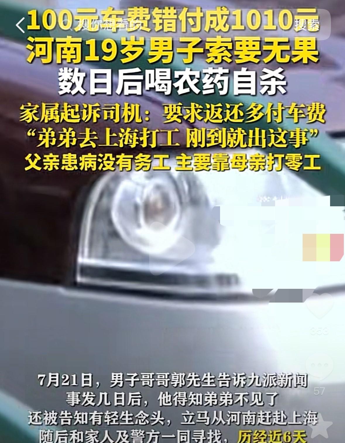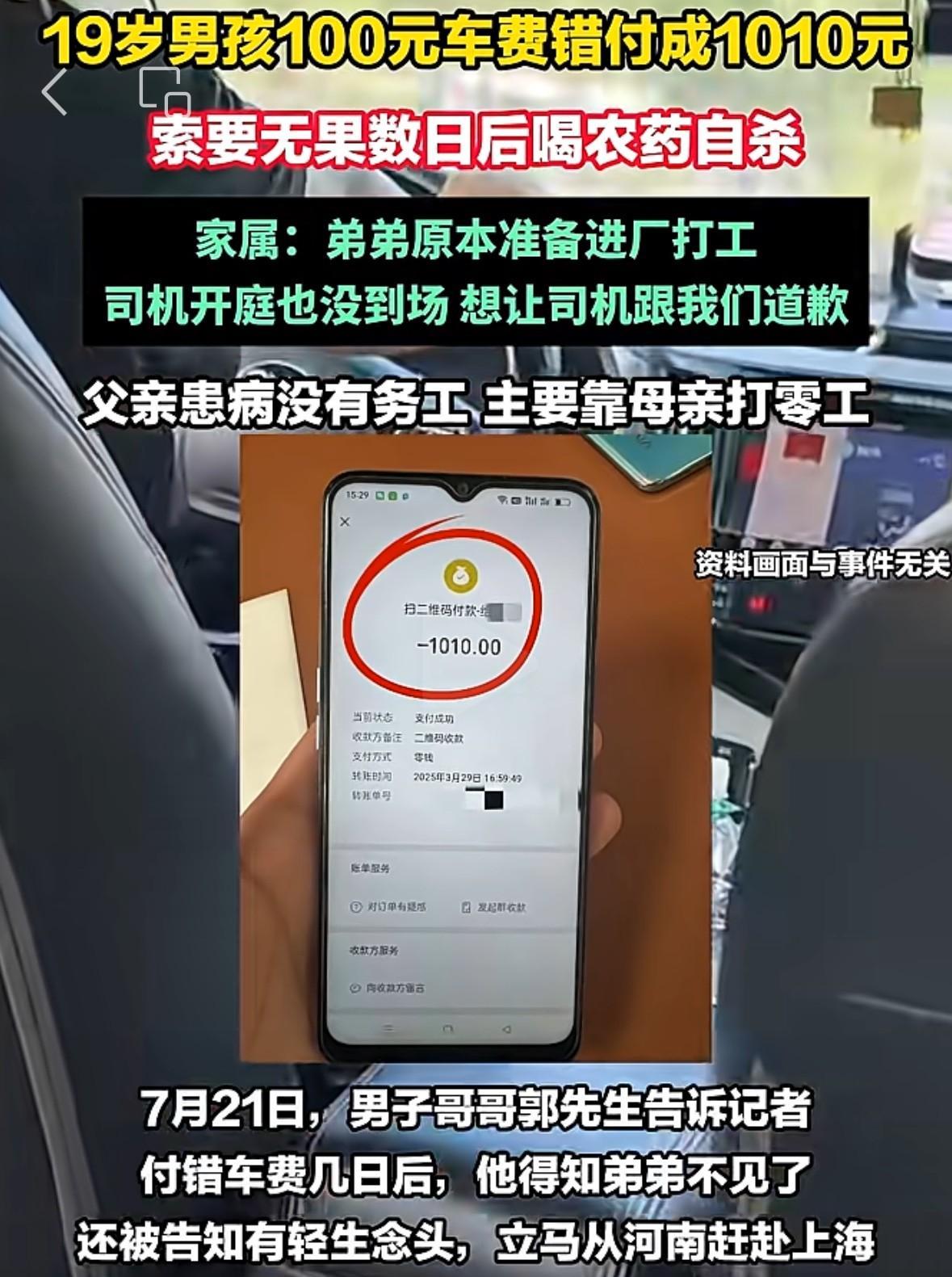 无比悲痛!河南19岁男孩将100元车费错付成1010元后,竟然选择了自杀![流泪]事实上,他发现给错车费后,曾多次联系司机,只可惜对方一直置之不理,不退给他。 事情大概是这么一回事: 2025年3月下旬,河南19岁的小郭来到了上海打工。他从车站走出后,便打了一辆车前往目的地。上车后他和司机说好车费为100元,结果支付费用的时候却不慎输错了数字,将100元付成了1010元。 等到发现这个情况的时候,司机早已经离开了。之后小郭通过付款记录,多次给该司机留言,请求他把多余的钱退回给他。无奈,对方始终不理。 后续几天他心情一直不佳,并且有了轻生的迹象,他的同伴便将这个情况反馈给了他的家人。之后,家里人立马乘车赶往上海,可最终还是迟了一步……因为那会,小郭已经离开了上海。等到小郭在苏州被找到之时,已经过去了好几天,那时候他已经没有了生命体征! 让人更心疼的是,小郭家庭条件较差,他的父亲身患重病,没有劳动能力,家里全靠他母亲打零工维持生活。 为了减轻家庭负担,小郭并没有选择上大学,而是早早的选择了自力更生。之所以去上海,是想在大城市找个工资稍微高一点的工作补贴家用。 没想到,一切还没有来的开始,悲剧就发生了。 付错车费以后,小郭一直想方设法联系那个司机,可对方始终无动于衷。 在这个事情里,那个司机真的是缺了点良知啊!不管是什么行业,赚自己应得的钱是最基本的底线。一个刚出社的年轻人,本就不容易,那可能是他未来一个月的生活费啊! 他的所作所为,间接让一条年轻的生命失去了活下去的希望![祈祷][祈祷][流泪] 悲剧发生后,小郭家人已经起诉了这个司机。7月16日,是案子开庭的日子,可这位司机却压根没有到场。直到现在,小郭家里人不仅没有见到他,甚至都没有等到他一句道歉! 可怜的小郭,真的是太冲动了,以他的家庭条件来说,多付得900元对于他来说或许太过沉重,但生命无价,无论如何,不该做出这样的选择啊![祈祷][祈祷][祈祷]