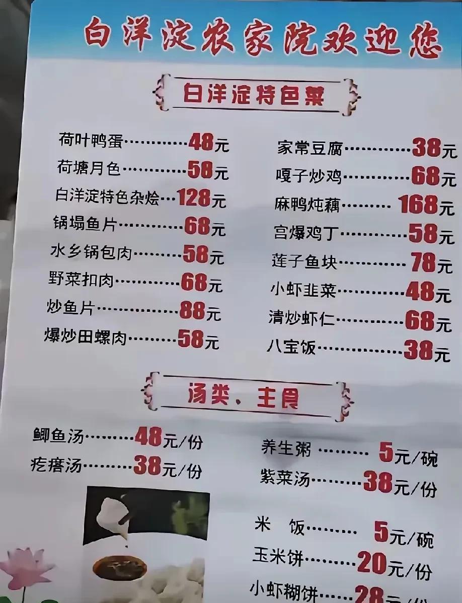 白洋淀景区菜谱,和山西景区菜谱, 对比下价格:白洋淀1个菜,顶平遥古城4个菜。另