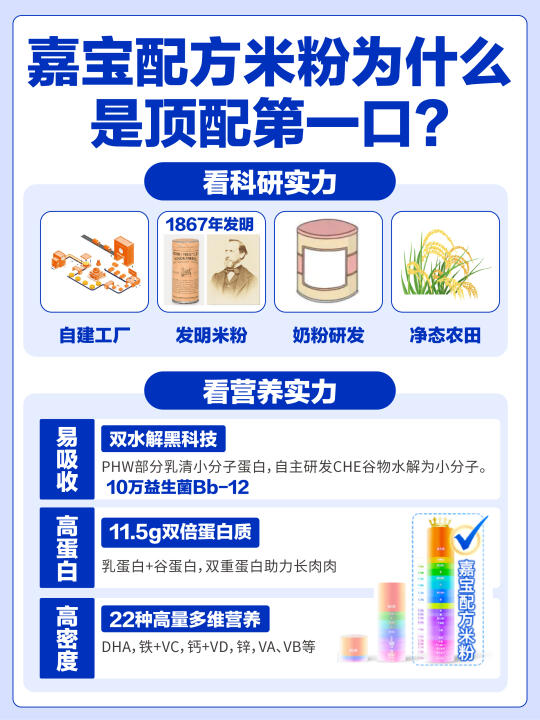 ✅不仅如此,嘉宝背靠雀巢150年的母婴科研硬实力,在米粉的研发上也是下足了功夫,就连工厂也是雀巢亲管建厂,从原料到成品全程严格把控,这点真是一下子打消家长们的顾虑~