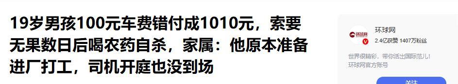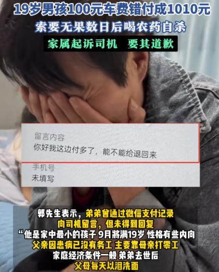 7月22日报道,3月29日河南鹤壁19岁的男孩,从老家投奔上海的堂哥,男孩准备趁着暑假的时候给自己赚点学费。男孩家里条件一般,9月就要过19岁生日了,是家中的老小。父母都是50多岁,父亲身患疾病,家庭的重担都在母亲的身上,所以男孩平常也非常懂事。 这是男孩第一次坐动车,第一次来到上海,他对自己的未来充满期待。生涩的男孩好不容易摸索着出了高铁站,就准备打一个出租车去往堂哥的住处。他们在车下商量好100元的车费,男孩也就上了车。到达地点之后,因为看见堂哥太兴奋,男孩一手滑输入了1010元。 等男孩发现的时候,出租车早已跑的无影无踪。无奈之下男孩只能加上师傅的微信,让师傅将多余的钱给自己退还回来,并表示这是自己一个月的生活费。可是无论男孩怎么哀求,消息都石沉大海,没有一点声音。 对于家里贫寒的他,1000元就是天,他感觉这些钱就像一座大山压在他的心头,让他无法喘气。和堂哥说了这件事情之后,在堂哥的带领下男孩也去警局报了案,可除了车牌号,司机何种身份,是谁他都不清楚。警方立案之后,就让男孩回家等了。 男孩回到堂哥家睡不着觉,吃不下饭,满脑子都是如果这个钱回不来他该怎么办?1000元可以帮父亲买一个月的药了,也够一家人一月的餐费了。男孩越想越难过,没有消息的每一天都是煎熬。 4月3日,男孩实在接受不了因为自己的一时疏忽,造成这么大的损失,和堂哥留言说自己走了,就失踪了。堂哥这几天不断在宽慰男孩,可男孩的精神状态都不好,担心堂弟出事,所以就赶紧通知了男孩的亲哥哥。哥哥第二天早上就来到了上海,和堂哥开始寻找。 在警方的帮助下得知堂弟去了苏州,哥哥前一天收到弟弟同学的语音,弟弟说他喝了半瓶农药,让同学帮忙过几天之后,在联系他的家人。哥哥的心中非常焦急,担心弟弟真的做傻事。可奇迹并没有发现,他们最终在一家殡仪馆中见到了弟弟的遗体。 殡仪馆说弟弟是在一个山里被发现的,身边还有一个已经喝了半瓶的敌敌 畏,遗体已经有腐烂迹象。哥哥看着弟弟的遗体几乎站不稳,他不明白为什么有人的心这么狠,也惋惜弟弟为了钱失去了生命。 哥哥将弟弟的遗体安置好之后,随即就将司机和出租车司机起诉,哥哥要求出租车公司根据车牌号,提供司机的身份信息,也希望司机退还多收的车费,以及赔礼道歉,可司机到最后都没有出现。 多付了这么多车费,过去了这么多天,司机说不知道根本不可能,他不知道因为自己的一时贪心,毁掉了一个年轻的生命,这钱拿着不烫手吗?
