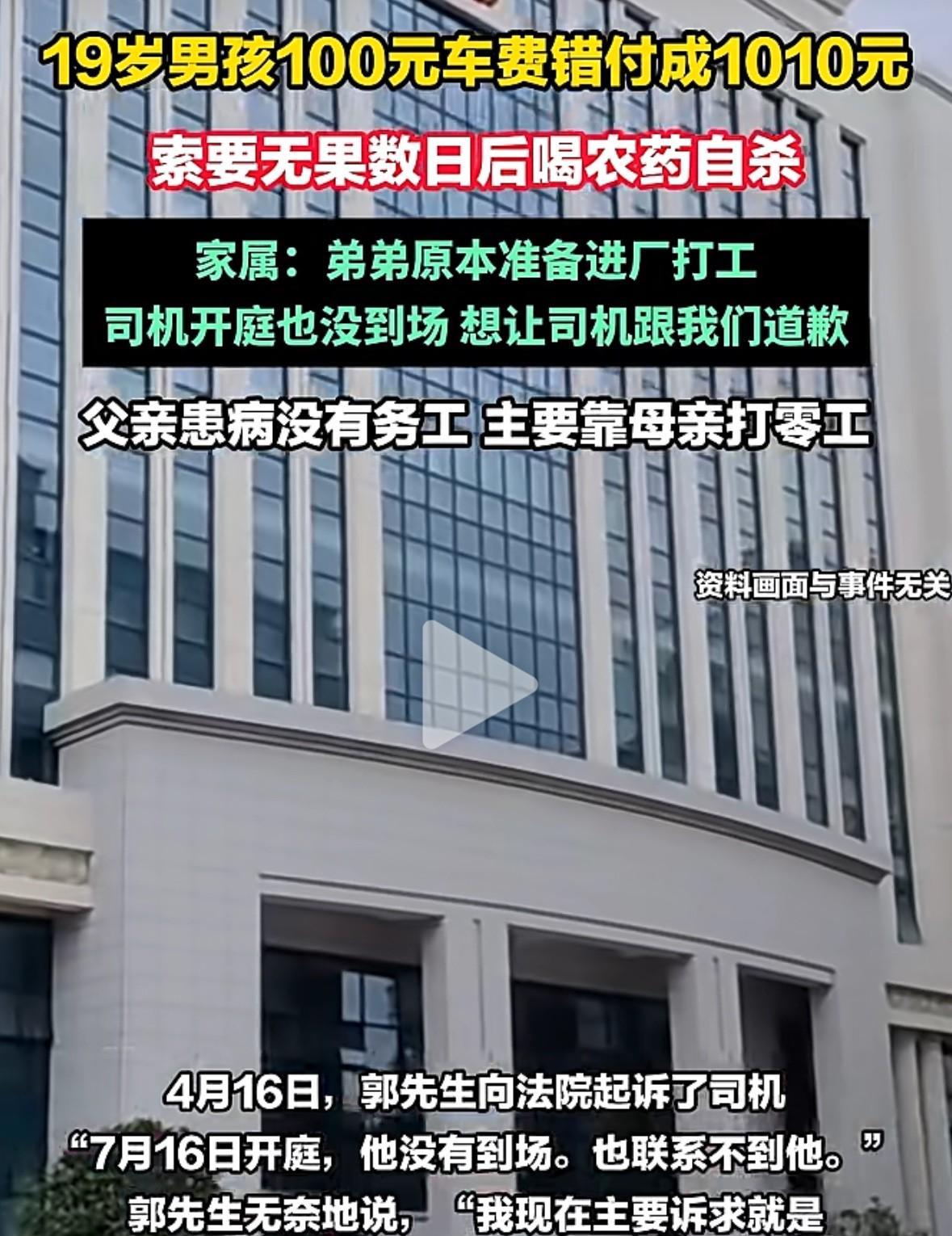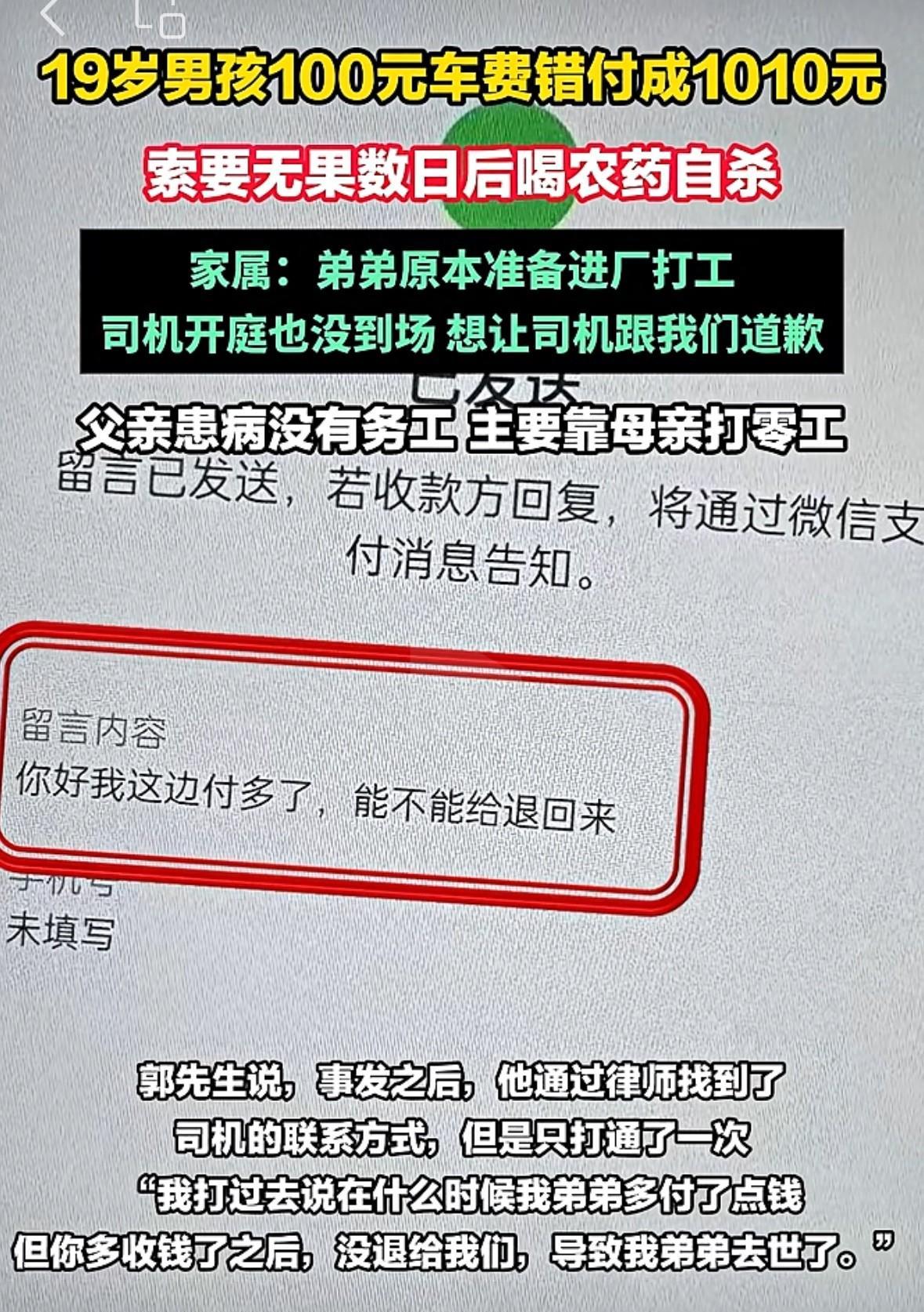 河南19岁男孩在上海打车将100元车费付错成1010元后,他喝下了半瓶敌敌畏,最终身亡![流泪] 让人更痛心的是,这个男孩来自河南鹤壁的一个贫苦之家。他家里条件很不好,早些年他的父亲因病失去了劳动能力,平日里一直靠母亲打工维持生活。 于是,男孩放弃了读大学的机会,还不到19岁就出门打工了。 因为有同学在上海,所以他也满怀希望想要到那个大城市找到一份心仪的工作。 2025年3月下旬,男孩大包小包从河南出发乘车到了上海。因为行李太多,出站以后,他就打了一辆车子前往目的地。 原本100元的车费,男孩在下车前却一不小心输错了数字。等到回过神来,车子早已绝尘而去。 他家本就不容易,那些钱都是父母省吃俭用下来,给他出来找工作的费用。对于他来说多付的910元,不是一笔小数。 于是,男孩想方设法联系那位司机,并且得到了他的电话号码。可那位司机在接下来的多天,一直置之不理,不肯把多付的费用退回给他。 最终,男孩绝望了!他离开了上海,自己一个人去到了苏州。谁也不知道,他在生命的最后,在想些什么。 2025年4月6日凌晨,他给同学发去了两条语音信息。 信息的内容是:他已经喝下了半瓶敌敌畏,希望同学过几天再告诉自己的家人,但他并没有透露自己的具体位置。 家人通过他的同学得知消息后,火速前往上海寻找,并报警求助。最终,男孩的遗体在苏州一处地方被发现。 悲剧发生后,男孩的家人起诉了那位司机,可遗憾的是,对方不仅没有出庭,至今没有向他们当面致歉! 坦白说,看到这个事情的详情,心里真的很不是滋味。[流泪][流泪][流泪]男孩多给出的900元,于富人来说,不过是一顿普通的饭钱,然而在这个男孩身上,却是不可承受之重,并成了压垮他的最后一根草! 希望每个人都能多点爱心,刚出社会的年轻人很不容易。他们手里钱不多,找到工作之前,不仅需要省吃俭用,还有一定心理压力。每个人都是从年轻时走过来的,家家户户都有孩子,凡事换位思考一下,我们的社会一定会更加美好! 在此,真的不能理解这个司机的做法!男孩付错钱后的几天时间里,一直联系他好话说尽,请求他退款,然而他始终无动于衷,如果他当初肯把钱退给男孩,这个悲剧就可以避免啊![祈祷][祈祷]