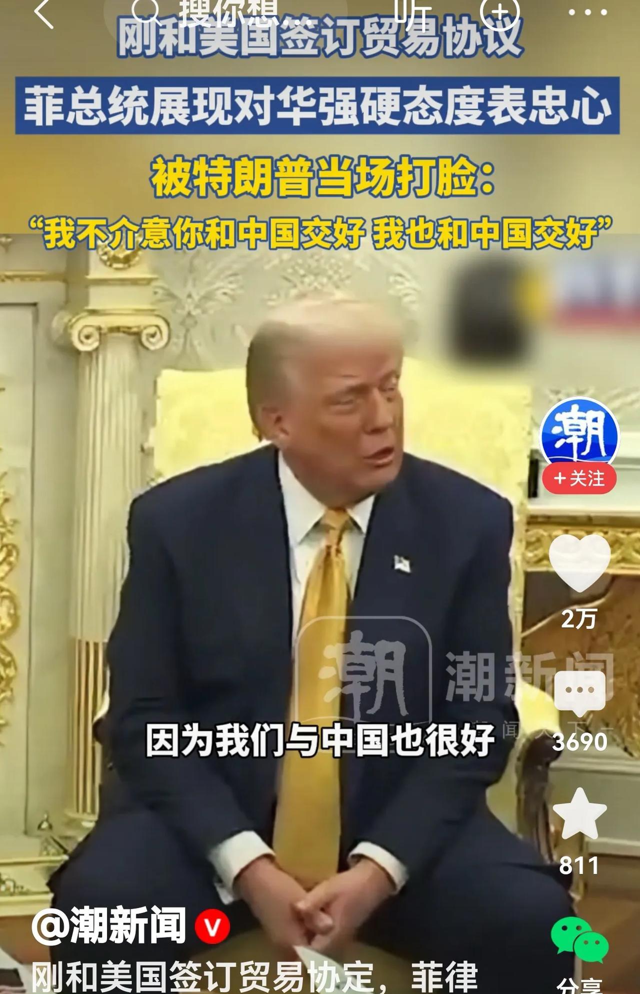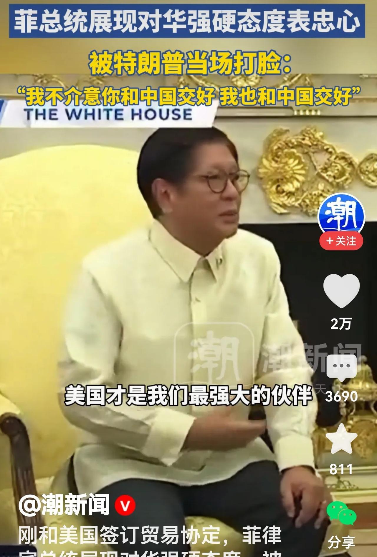 马科斯访美,打脸来的快。 菲律宾总统马科斯去美国访问,去之前做足了向美国表忠心的课程。比如菲海警在黄岩岛主动挑衅中国执法船,国防部长还与美军高调宣称《美菲共同防御条约》覆盖南海等等。 在白宫和特朗普会谈时,他刻意强调:“菲律宾的外交政策是独立自主的,说我们和中美的关系,美国才是我们最强大的伙伴”,这是暗示菲律宾将坚定站在美国阵营对抗中国。然而,特朗普的回应却让现场气氛骤冷:“我不介意你和中国相处好,因为我们与中国相处得很好。” 这句话直接戳破了马科斯精心设计的“反华秀”。 这次会谈并没有达到马科斯的目的,关税仅仅从20%降到19%,菲律宾的投名状和盟友仅仅价值1%关税。
