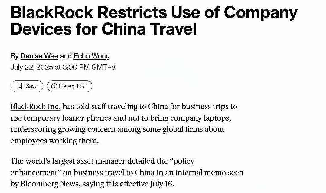 富国银行高管茅晨月被限制离华,结果看到贝莱德告知员工,去中国出差时不要使用一切有