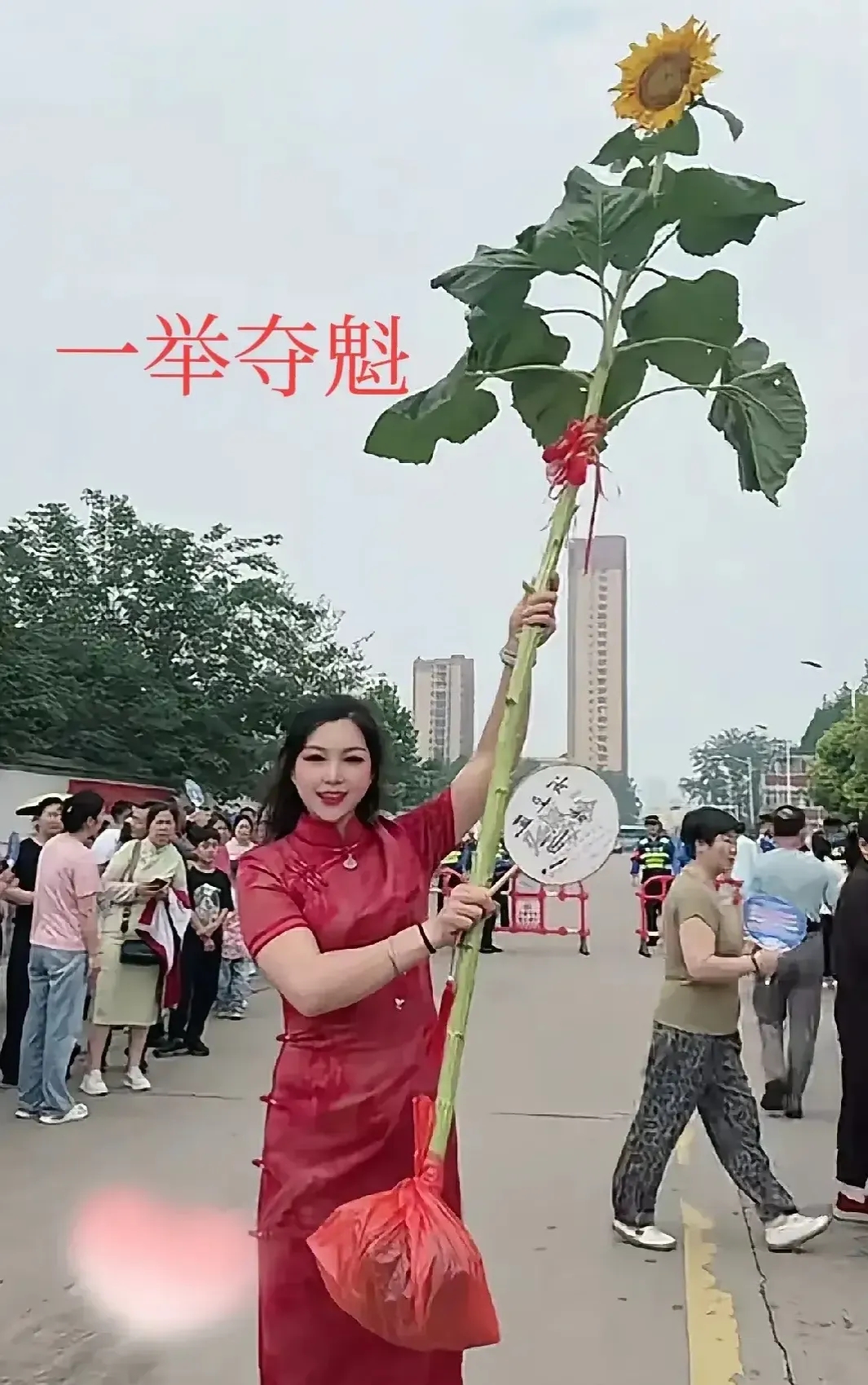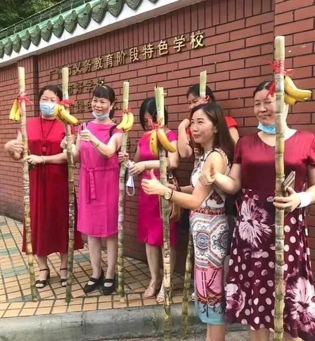 高考家长们穿旗袍寓意“旗开得胜”,举向日葵寓意“一举夺魁”,拿甘蔗上面挂上香蕉这又是什么意思呢?