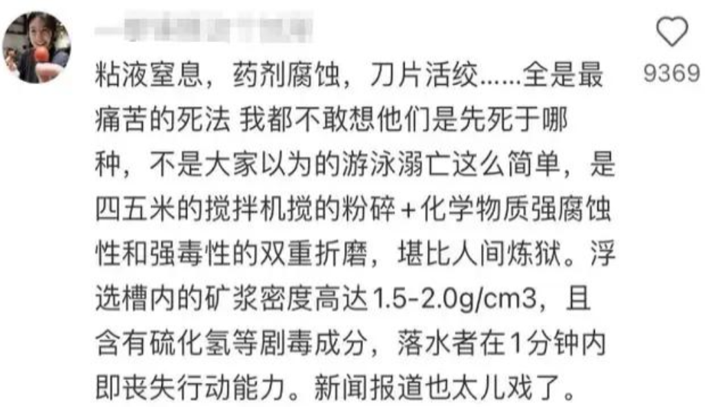 一位业内人士表达了与该同学相同的观点,他称,铜钼矿浮选槽是一种用于铜钼矿浮选分离的关键设备,通过泡沫浮选法将有用矿物与废石分离。浮选槽中的矿浆水含有悬浮物、化学药剂和重金属离子,具有腐蚀性和高温风险,需注意安全防护,人一旦掉进浮选槽,基本没有生还的希望。