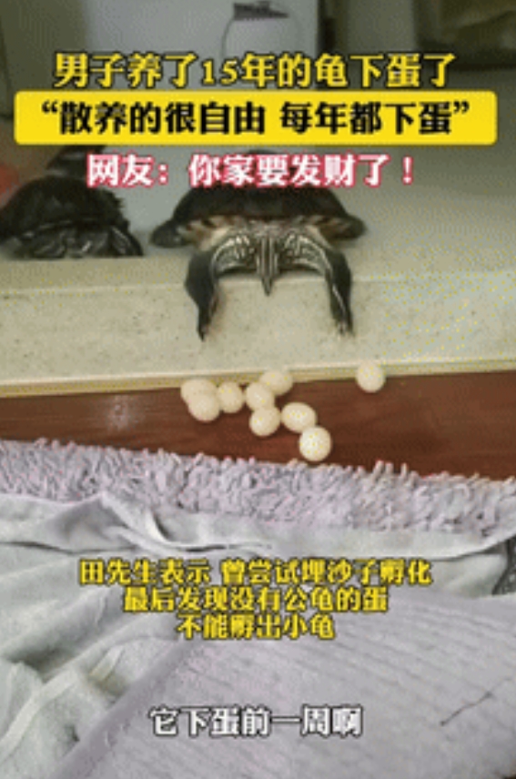 “意外的惊喜!”辽宁大连,一男子去卫生间时,突然发现养了15年的龟倒趴在门槛上,他仔细一看,龟竟然在下蛋,妻子见状,直接蹲在地上拍摄龟下蛋的过程,网友:乌龟生蛋,家里要发大财了!