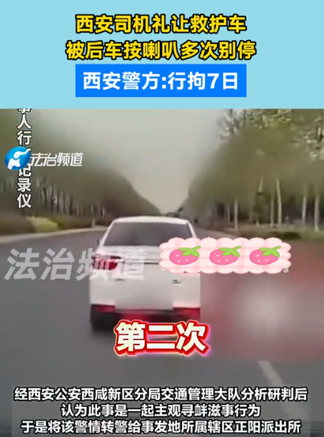 “支持严惩!”西安一位司机在听到后方有救护车通过时,司机主动选择了让行,使得救护车能够优先通过红绿灯路口。但就在让行结束后,后车频繁催促按喇叭,通过路口后超越该车,并多次将其别停,无奈之下司机只好报警。 “真是典型的没事找事,无事生非!” 据法治现场4月24日报道,西安司机礼让救护车后,被后车喇叭多次别停。 在西安的兰池大道,每天都是车来车往,可就在前不久的一个早高峰,这条熟悉的路上却发生了让人又气愤又感动的一幕。 那天一早,男子像往常一样开车上班,快到红绿灯路口时突然听到后面传来救护车的警笛声。 他二话不说,立刻打开转向灯靠边,让出了一条通道。 毕竟他知道,救护车多抢一秒,可能就多救一个人。 对他来说,这就是举手之劳,也是开车人最起码的责任。 救护车顺利通过后,李先生正准备重新起步,没想到这时候身后一辆银色小车开始狂按喇叭。 他从后视镜里看到,车里司机一脸不耐烦。 男子也没多想,赶紧起步想让开,结果这辆车突然猛地一脚油门冲上来,直接在他前方来了个急刹车! 男子吓得赶紧踩刹车,差点撞上去。 接下来更离谱了,银色轿车竟然连续变道、反复急刹,几次故意挡在他前头,还一度逆行把他逼停在路中间。 短短几公里的路,竟然被这辆车来回别停了好几次! 男子气得不行,车上还有小孩,手心都捏出汗了,最后只能报警求助。 警方接到报警后,调取了李先生提供的行车记录仪,很快锁定了那辆“疯狂小车”的司机谭某某。 4月17日,他被警方依法传唤到案。 在警察面前,谭某某解释说:“我当时从收费口下来,本来想赶个绿灯过路口,结果他突然在直行道上停住了,我就来气,按喇叭他还不动。” 更夸张的是,他也承认看到了前车是为了让救护车让道,但就是因为心急火大,一时冲动就做了“别车”这种危险行为。 事后他也知道自己太鲁莽,在警局里向李先生表达了歉意。 办案民警严肃指出:“你这是一种违法行为,说白了就是没事找事没,无事生非。” 最终,警方依法对谭某某处以行政拘留7日的处罚。 这事曝光后,引起了不少网友关注。 评论区里一片骂声:“这人也太不讲理了,让救护车你都能气成这样?” 也有很多人为让救护车的男子点赞:“这种事就该坚决让行,做得对!” 其实啊,为救护车让道,是我们每个人应尽的义务。 而像谭某某这样因为情绪失控而失去理智的行为,不仅可能造成事故,还让自己吃了官司,得不偿失。 这事也给我们提了个醒:上路开车,别光想着自己快点过红绿灯,更多时候,礼让三分,是对生命的尊重,也是对城市文明的守护。
