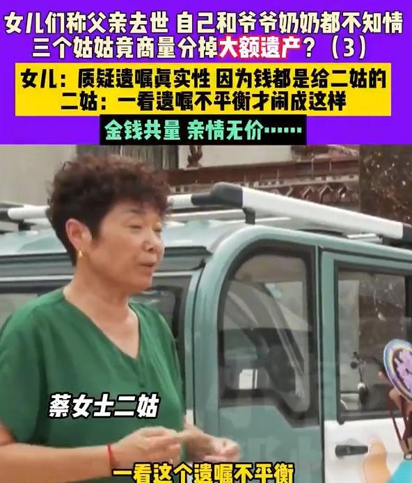 “太不可思议了!”河南商丘,女子得知父亲去世,准备继承遗产!不料,却被告知,她父亲的遗产,已经被3个姑姑偷偷瓜分殆尽!她找到3个姑姑对峙,却没想到,大姑和三姑都心里有愧,可二姑却嚣张表示:这是我们该得的,这是我哥的遗愿! 原来,父亲1月出车祸去世,但是作为女儿却不知情。3个姑姑也没有告知她们和家里长辈,偷偷把遗产给分了,还说这是她们哥哥立下的遗嘱,蔡女士质疑父亲遗嘱的真实性。 老屋的钥匙换了,银行存款取空了,连车祸赔的钱也没影。蔡女士找到大姑家,大姑搓着手,“是你二姑的主意,说你们嫁出去了,不该沾娘家的光。” 三姑蹲在门口,“她分了大半,现在天天做噩梦,说心里不踏实。” 二姑叉着腰站在院里,“咋了?这是我哥的遗愿!有遗嘱!我们照顾他这些年,分点东西不该?” 蔡女士要瞧遗嘱,二姑支支吾吾掏不出来,只说 “当时忙,忘了告诉你们和老人”。 爷爷奶奶坐在炕沿上抹泪,“儿子没了,孙女蒙在鼓里,家产倒被闺女分光了,这叫啥世道!” 蔡女士摸着父亲常坐的藤椅,“我不是图钱,可他们连句信儿都不给,连最后一面都不让见,这心也太狠了。” 村支书来调解,“按规矩,女儿也是第一继承人,瞒着分遗产,于情于理都说不通。” 有亲戚叹气,“为了钱,连亲情都不要了,以后咋在村里抬头?” 视频发到网上,有网友说:“遗嘱真假先不论,瞒着亲侄女和老人,这操作就见不得光。” 还有人说:“二姑说‘该得的’,怕是自己心里都虚。照顾哥哥是本分,不能当抢遗产的幌子,亲情被钱蛀空了,夜里能睡安稳?” 听着这事心里头不是滋味,老话说 “钱财如粪土,仁义值千金”,可真到了钱跟前,有些人就把仁义丢了。蔡女士的父亲不管和女儿亲疏如何,按法律,女儿有权继承遗产,姑姑们就算照顾过哥哥,也不能把人家应得的那份硬抢了去。 偷偷摸摸分遗产,瞒着该知情的人,这不是算账,是耍无赖。就像老辈人讲的 “君子爱财,取之有道”,不是自己的,强拿硬要,早晚得还回去。 说到底,遗产这东西,该是谁的就是谁的,抢不来,藏不住。法律有规定,良心有标尺,为了点钱闹得众叛亲离,不值当。老话说 “人在做,天在看”,昧良心的事做多了,早晚得栽跟头。 希望蔡女士能讨回公道,也希望这几个姑姑能明白,亲情比钱金贵多了。 但话说回来,别的不太关注,就是父亲去世,女儿也是必须知道消息的吧?作为女儿,都不知道亲生父亲去世的消息,并且遗产都被瓜分完了,这下才想起来父亲来了?搞不懂这是怎样的一个家庭……