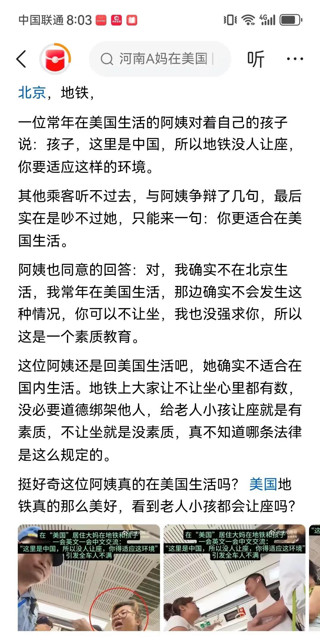 北京,地铁,凭什么给她让座?就因为她是美国人吗?看她吵架的气势,年轻人都没有她身体壮。 在纽约她敢瞎嚷嚷,黑人直接就抡拳头,也就是在国内打人犯法。 美国怎么样,她是不是美国人,这些都不重要,她说的这句是真的:中国的地铁是没人让座的。 对于老人,孕妇和孩子是要让座的,我有次去广州坐地铁,我带着我小孩和老婆,还是有好多年轻人让座,不是是网上说的年轻人不让座的现象,可能有不让座的,毕竟是少数。 我30带孩子出门都有老年人给我让座,我告诉孩子要照顾尊重老人,抱紧我腿,让婆婆坐。 这要看情况而定,老人要是身体倍棒,行动健硕,不会让座。如果老人身体不好,摇摇晃晃,肯定让座,不是是老人孩子就让座。 是,他在美国的确会有人给他让座,全世界各个地方,你不管看到谁被黑人打倒在地,周围的人都会散开的,的确会给他让座,他不仅能坐,还能躺。