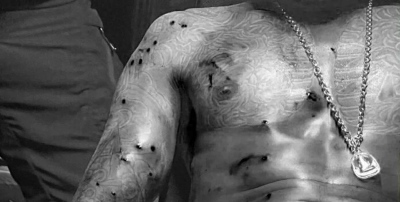 混乱中,一名32岁的男子腹部被霰弹枪打中,身上大约有20处伤口。