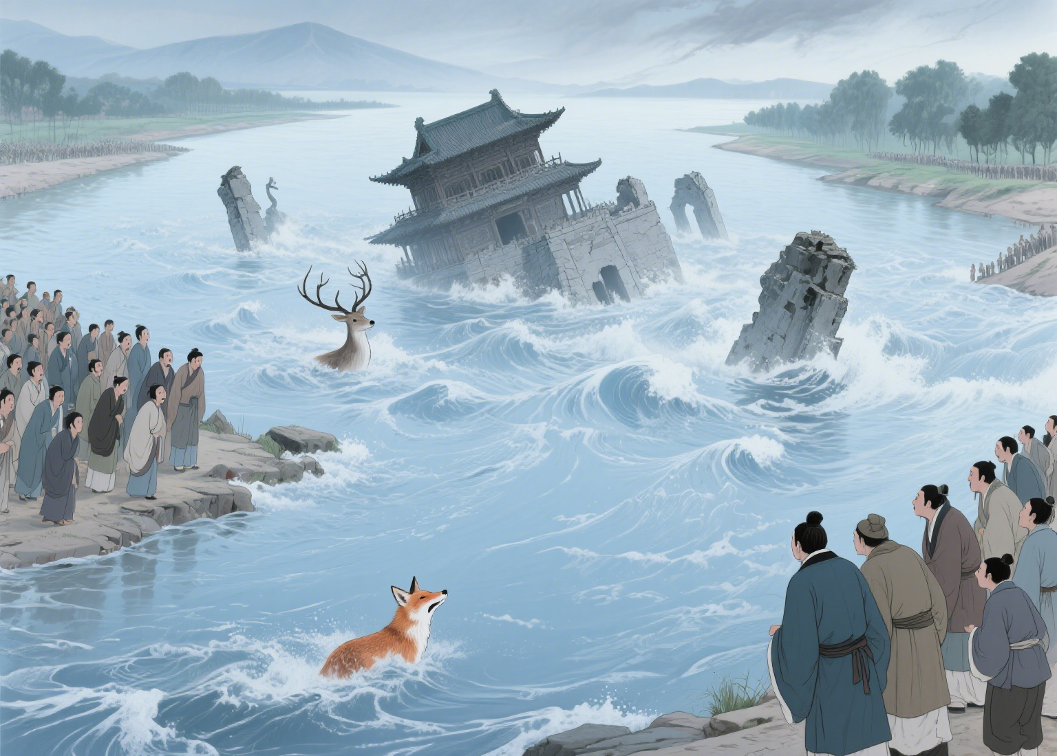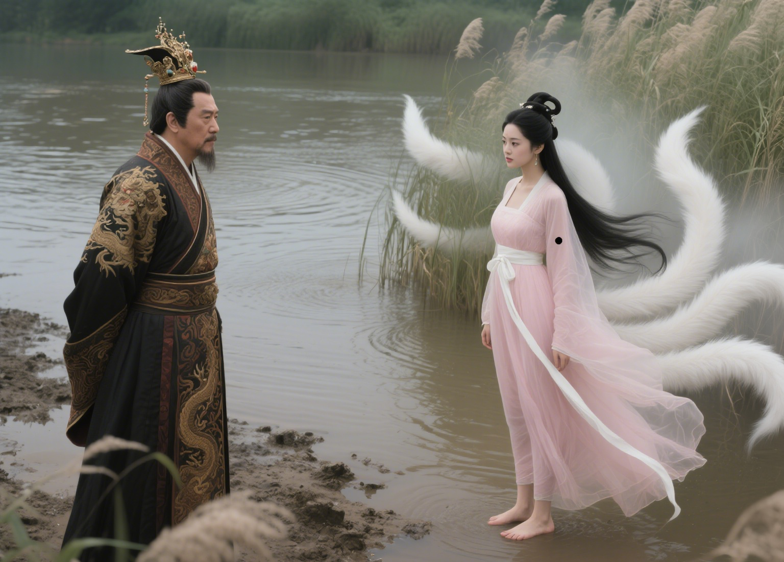 那年淇水涨了三月,河底翻出的淤泥都带着腥气。 纣王就在这时候遇上了那女子,她赤着脚站在芦苇荡里,九条蓬松的白尾在水雾里若隐若现。 “小女苏妲己,家住河西苏庄。” 她笑起来眼角有颗痣,唱的淇水谣比岸边浣纱女还清亮。 纣王把她带回鹿台时,谁也没瞧见她袖中藏着的河泥。 妲己专爱吃淇水白鱼,要纣王派三百渔夫连夜捕捞。 她教宫娥唱 “桑中” 歌谣,引得年轻侍卫翻墙来会,被纣王砍了脑袋。 老臣比干劝他:“这女子眼尾分九叉,恐是邪物!” 纣王却把比干的心脏挖出来,说要看看忠臣的心是不是七窍。 一日妲己说要建摘星楼,得用淇水边千年桑木。 百姓连夜伐树,忽见树洞里跳出无数白狐,全往淇水钻。 妲己在鹿台设宴,忽然指着河水尖叫:“那不是我爹娘吗?” 纣王探头去看,水面浮出无数白骨。 妲己现了原形,九尾扫得梁柱断裂:“你先祖焚我狐族于桑林,今日该偿命了!” 鹿台塌时,纣王才看清她眼角的痣原是个“仇”字。 淇水吞没鹿台那天,两岸百姓听见水底传来狐狸的哀鸣,混着纣王的哭喊。 后来人说,那水腥气三年不散,是狐狸精在哭,也在笑! 世间祸事,从来不是外因作祟,是心里先养了贪嗔痴的狐狸啊。