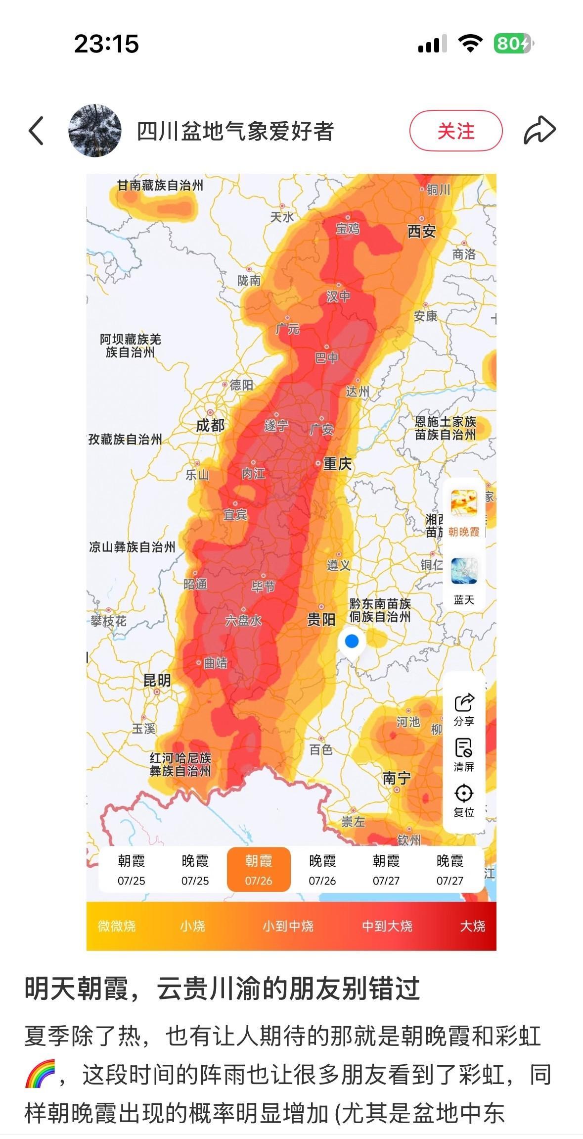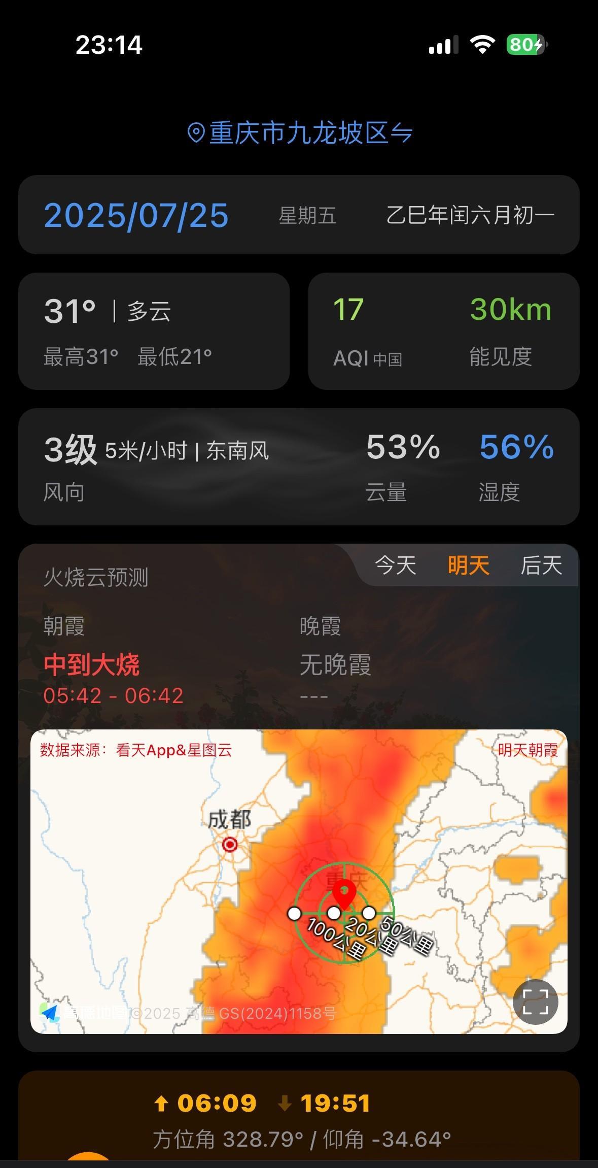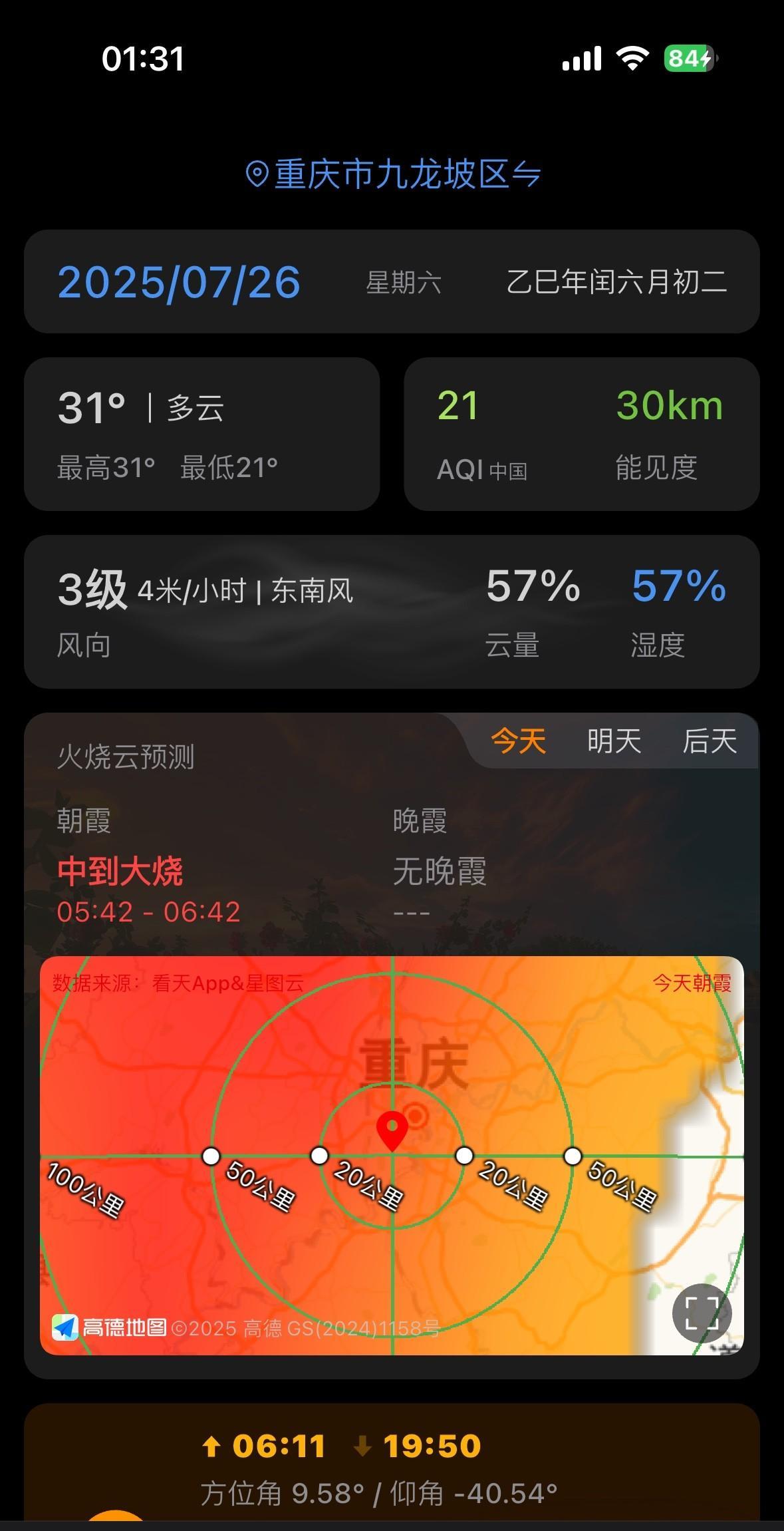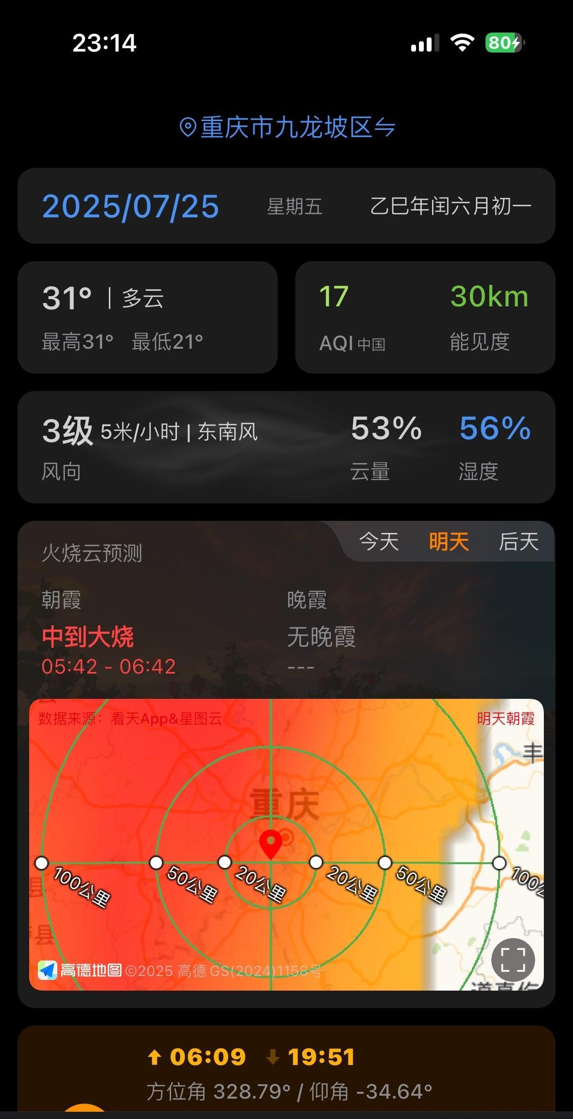7月26日,星期六,重庆主城区,可能会有史诗级的朝霞和美丽的日出,大家可以去缙云