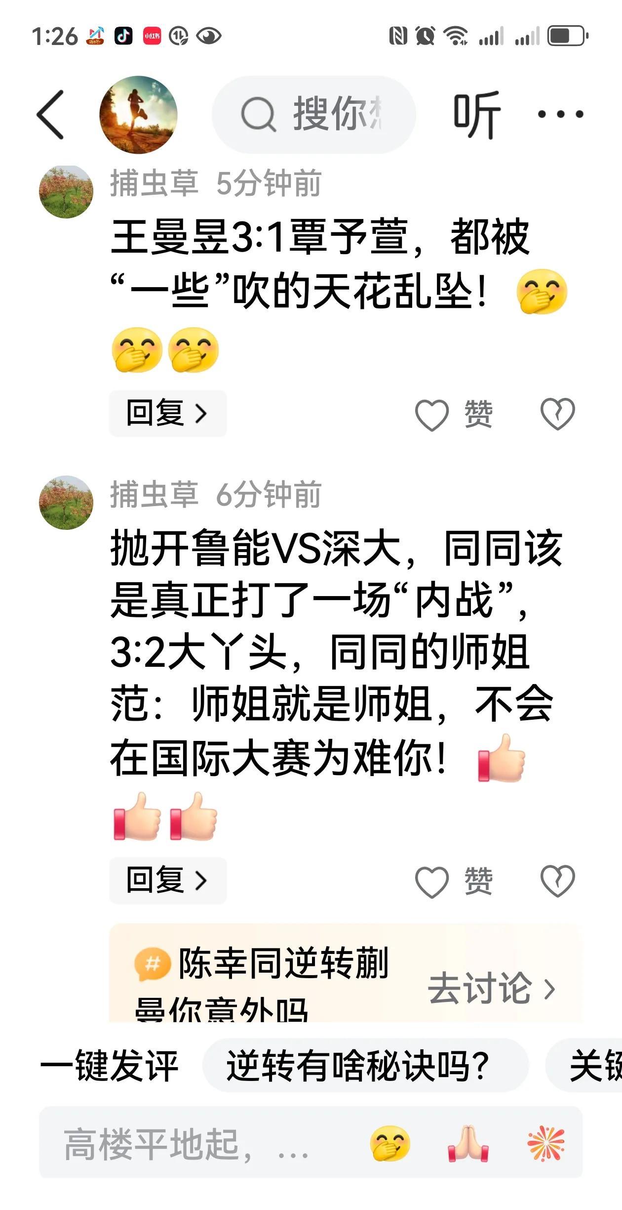 2025乒超第二阶段比赛:一场非常有意思的对决! 孙颖莎未参赛的深圳大学1:3山东鲁能,成了今晚热门话题了吧,让一些“抬王曼昱诋毁孙颖莎”的黑喷,情何以堪,也又“窃喜自嗨”了一次… 莎莎担当起了覃予萱、平野美宇的场外指导!至少为培育年青选手提供历练机会!深圳大学也不会在意一场比赛的输赢吧,给一批“自嗨”的,撒了一写“狗粮”吧… 图片多来自@网友,也关注评论区呵呵。 莎莎没有参加的比赛,老王的国乒,以及被搞的更乌烟瘴气的舆论,看乒乓球赛的兴趣,急剧减少,或许一些条友也是这样吧。中国女排,被菜鸟搞的,直播被央视放弃了… 乒乓也被央视大幅度选择直播了,期望别与老王有关系…