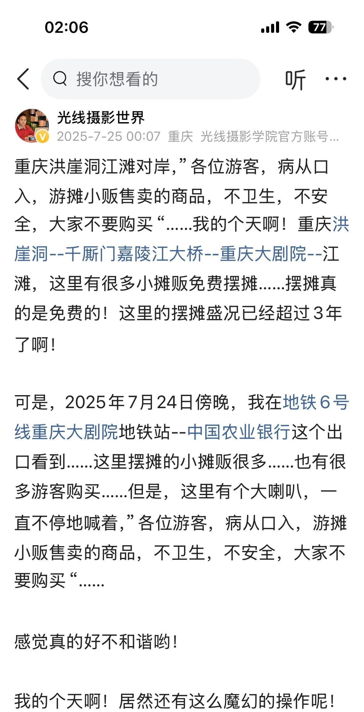 7月25日,星期五晚上,重庆洪崖洞的人流量相比昨天前几天有明显上涨,我在地铁6号线的重庆大剧院站和小什字站,明显有感觉……可是,昨天晚上,重庆大剧院地铁站外面都有很多摆摊设点的小摊贩,可是,今晚,却真的没有了!难道,现在,洪崖洞这周边,洪崖洞半径1000米……难道接下来要对摆摊设点的小摊贩严格管理?! 我也不是很清楚……不过,今天是星期五的晚上,所以,洪崖洞半径1000米的这些热门好去处,今晚人气比较不错。#光线摄影世界曾兰谈天说地#