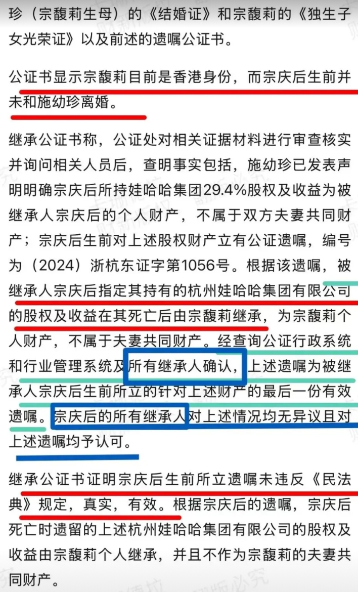 杜女士太贪心了!2018年之前一直在要抚养费,2019年与宗庆后见面还偷留下两人见面的音像资料,甚至连30年前的邮件往来都保存着。 早在N年前就开始布局,可惜,没想到宗老背着她还留了另一份“专属”遗嘱。 她的绿卡原来是这么来的——EB5移民法在1993年特别增设了“间接”,补充后成为“直接或间接创造10个全职的美国工人就业机会”,限制条件放宽,申请核准时间又快。 而且只要第二年投资行为仍在继续,超过一定天数就可以成为永久居民。 杜建英90年代可不只是96年才去的洛杉矶陪读,在此之前娃哈哈就有海外业务。 她2008年从娃哈哈离职,2009年申请,2010年得到绿卡,时间就对上了。 宗继昌上大学的钱是从娃哈哈美国账上划走,他们还以宗家名义花2000多万美金买了豪宅。 大小姐如果深究其动用公司账户“公为己用”,也说得过去。不找波,估计是想息事宁人。 还有在米国申请的亲子鉴定,只写申请,没写结果。即便有结果,拿回来也没权威性,得重新验。 大小姐有独生子女证,标准的婚内独生女;有经过公证的遗嘱,而且注明属于她婚前财产,完完全全属于她自己。 杜女士一家如果聪明,应该争取与宗馥莉和解。手头资产也不少了,老盯着别人碗里的算怎么个事儿啊!