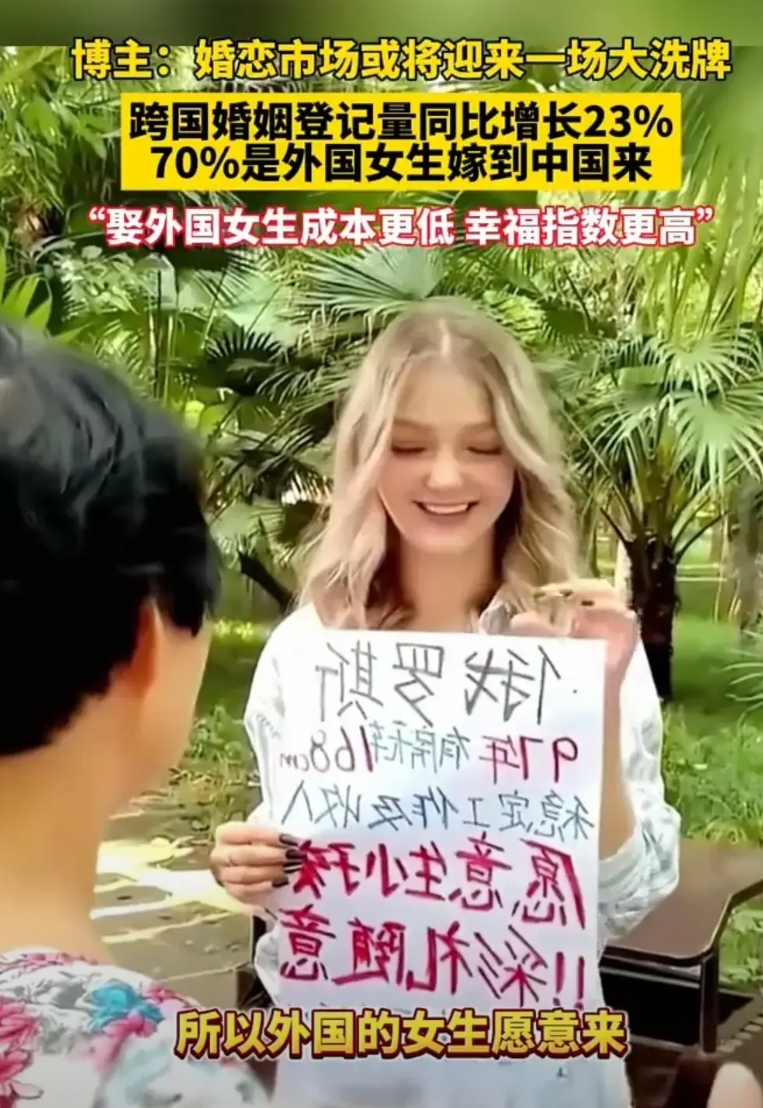 谁说剩3000多万男生娶不上媳妇儿的?数据来了,外国女生正在排队嫁给中国男生,去年跨国婚姻增长23%,其中绝大部分是外国女生嫁到中国来。 有人说是这是瞎说,能娶外国媳妇儿得也是有钱人家,没钱的人家也不来。可是去看看相亲角,俄罗斯的,乌克兰的甚至是欧洲女生为了留在中国不要彩礼也愿意嫁给中国男生。 国内的女生总认为男生不给彩礼就是穷和没有态度,认为国内男生质量不高,有的更愿意嫁给外国人。 可根据外国女生在各种直播连线上的反应来说,亚洲国家如韩国和日本女生非常认可中国男生勤劳肯干家务这件事,欧洲女生同样如此。 也许再过多少年,这个3000万找不到对象的可能就是女生了。