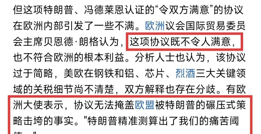 欧盟跪得太脆了!就这还号称世界一级?见过努力上餐桌的,真没见过上赶着往餐盘里爬的。 本来欧盟对美谈判就处于劣势,如果能跟咱们建立起良好的贸易关系,形成统一战线,至少可以跟懂王耗下去,结果冯德莱恩这老太太,跑咱们这来撂了一堆片汤话,光提要求(稀土、俄油等),却不谈利益交换,最后碰了一鼻子灰,悻悻而归。 然后扭过头去,就对美国跪了,协议内容主要包括: 1. 除芯片、酒类仍需谈判外,所有商品将被征收15%的关税,同时对美国0关税开放市场。 2. 在现有基础上,向美国追加6000亿美元投资,比日本还要高500亿美元。 3. 购买美国7500亿美元的能源产品。 4. 药品、金属存在分歧。 懂王宣称药品单谈,金属关税维持不变(钢铝、铜50%),但冯德莱恩说药和金属,统一都是15%,超出配额的部分,才是50%。 我估计最后还是以懂王为准。 5. 承诺大量购买美国的军事装备,这与北约购买美国武器援乌的计划相一致。 说实话,看到这份协议内容,我甚至都感觉日本占便宜了:欧盟等于在军工、能源、农业、科技等几乎所有领域,全面的割股奉亲,说是自己上赶着往餐盘里面爬,让美国吃爽喝爽,一点都不为过。 欧洲议会国际贸易委员会主席吐槽:这份协议根本不能令人满意,特朗普精准测算出了我们的痛苦阈值,欧盟被他给彻底击垮了。 多新鲜啊,手上没牌,内部一盘散沙,军事上还有求于美国,但又不愿意建立全球统一战线,你拿什么跟懂王谈?最后无非是割多少肉,懂王才能满意的问题。 我就问一句,你割的肉比日本还多,你俩谁是美国的好大儿?就这还号称世界一级?洗洗睡吧~
