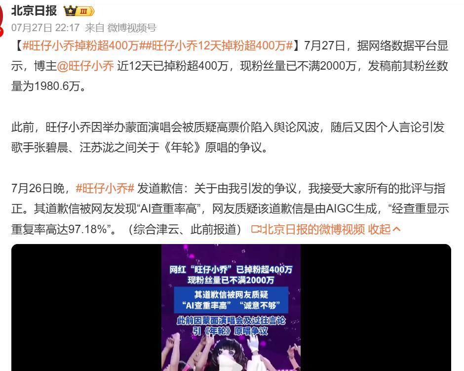 “原唱不能唱”的第三天 最大的输家出现了! 不是张碧晨,因为即便不能继续唱《年轮》了,她还有很多其他的代表作,《凉凉》《一吻之间》 《笼》《只要平凡》…… 除了这些火爆全网的歌单之外,以她的声色,未来也有很多的好听曲目等着她唱。 输家当然也不是汪苏泷,毕竟他是创作型的歌手,即便这首《年轮》是张碧晨唱火的,或者他本人唱的没有张好听,都不影响他在音乐圈的地位,他的才华取之不尽用之不竭,所以不差这首歌。 而最大的输家,是拥有千万粉丝的网红“汪仔小乔”。 三天前的原唱之争,就是因为她的发言挑起来的。 事情闹大,两个艺人开始了争论之后,旺仔小乔美美隐身。 事情平息之后,她又晒出了一份道歉声明,以为这样就能翻篇。 殊不知,清醒的网友才不买账。 目前,汪仔小乔的评论区已经沦陷了,粉丝已经开始大批量的脱粉,3天掉粉超过400万。 她精心筹备的演唱会,现在也不能如期举行了。 这一下,团队忙前忙后了三个月的项目黄了,还要赔场地费,违约金,退票等,损失不小啊。 最重要的是,还失了口碑,掉了人气,想翻身,怕是难了。