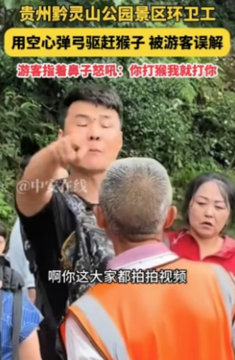据悉,这名游客不远万里从南京到贵州来看猴子,工作人员出于好心,用弹弓驱赶猴子。 结果这名游客不满景区用弹弓驱赶猴子,正义感爆发,扬言要打人。