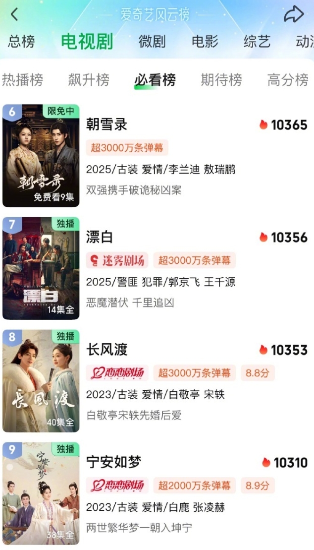 云合占比涨到32.4%了,播放量6800万,热度10365,爱奇艺站内热度历史排名第6,已经超了《漂白》,《朝雪录》是近一年来,唯一一部云合占比破30%的古偶剧,已经超点结束,8月16日结束热播期,只要云合集均到了3500万,那就是今年播放量前五的作品。
