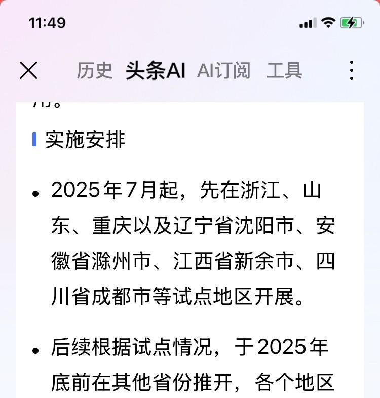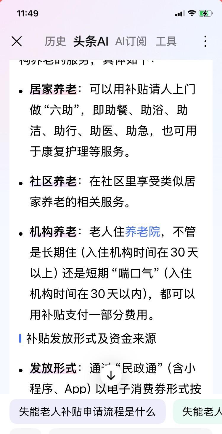 失能老人有补贴了? 昨天在母亲家,大弟看着手机跟我说“姐,国家有规定,从今年七月份起,失能老人有补贴了,咱妈也应该有,你有空问问社区”。 我很惊讶,这是真的吗? 今天上午,我给母亲所在的社区打电话,社区工作人员接电话说目前还不清楚,等问清楚了再联系你,留个电话号码”。 我留下了联系方式。 于是我又问Al“失能老人国家有补贴吗?”,它给我的回答很具体、很详细: “国家有针对失能老人的补贴。 2025年7月,民政部、财政部联合发布《关于实施向中度以上失能老年人发放养老服务消费补贴项目的通知》,在全国范围内组织实施向中度以上失能老年人发放养老服务消费补贴项目,这是我国首次在国家层面以消费补贴形式支持失能老年人照护服务。” “发放形式:通过“民政通”(含小程序、App)以电子消费券形式按自然月发放。 资金来源:国家出大头,地方出小头,不同地区比例不同,东部地区中央承担85%,中部90%,西部承担比例达到95%,地方承担5% -15%。” 不过,我看到介绍老人是否失能,会有专门的评估机构按照《老年人能力评估范围》进行评估的,有专门的申请流程。 最后,还说出了实施安排: “2025年7月起,先在浙江、山东、重庆以及辽宁省沈阳市、安徽省滁州市、江西省新余市、四川省成都市等试点地区开展”。 真是个好消息啊,有辽宁省的沈阳市,但是没有大连市,看来不在大连试点,因此目前还不能铺开,难怪社区说不清楚呢。 不管我老妈是否能享受到这个补贴,这对于失能老年人来说是好事,每个人都会老去,每家都有老人,失能老人能享受到这一补贴政策真的会给很多家庭减轻相应的经济负担和压力,这要感谢我们的党和政府对失能老人的关怀啊。