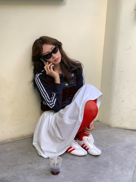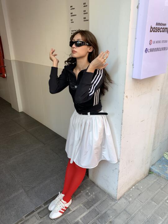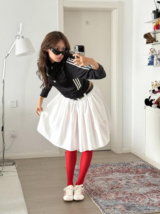 最近每天都能刷到Jennie的穿搭造型🥹 今天跟着灵感MUSE我也来搭配一套! 上身以黑色为主 长袖上衣搭配一件黑色吊带 叠穿的魅力就在于能营造出层次感还有材质上的碰撞 让简约的单品变成一套有力量感的look 下半身选了一件小白裙,甜酷平衡 再加上红色丝袜和三叶草薄底鞋 红色条纹相呼应 不就是最近很火的暴击流穿搭吗?🤔