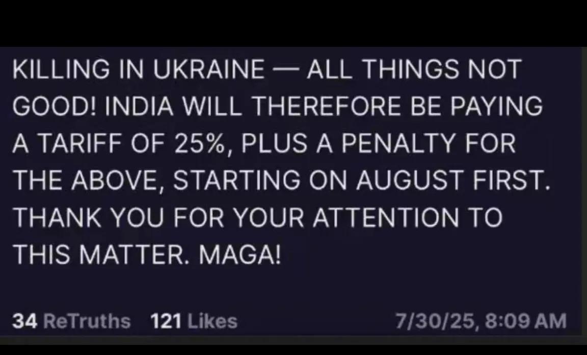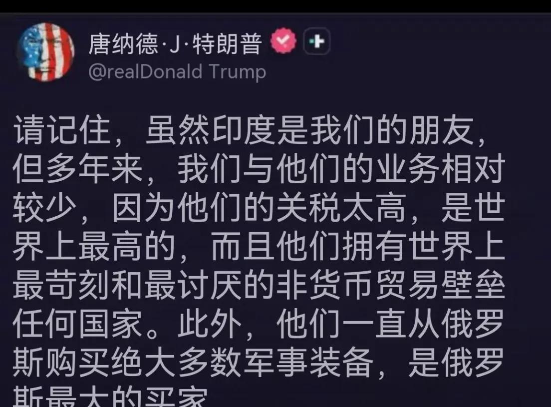 特朗普对印度说“这都不是好事”。 特朗普在推特上又发飙了,他说印度关税太高,是世界上最高的,而且他们拥有世界上最苛刻和最讨厌的贸易壁垒,他们还一直从俄罗斯购买军事装备,这些让(俄罗斯)在乌克兰杀戮,印度所有的事情都不是好事。印度将支付25%的关税,加上上述罚款,从8月1日开始执行。[捂脸][捂脸][捂脸] 估计莫迪老仙彻懵圈了。 大家对以上内容有什么观点和看法,欢迎评论区留言讨论参与到互动中来!创作不易,期待大家的点赞、评论、转发和分享!