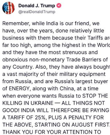 7月30日晚上,特朗最终发布了对印度的对等关税——25%。这个数字可以说远远超出了外界的预判,和美国最早谈判的印度,没想到“起了个大早赶了个晚集”。 特朗普在发文中对印度几乎“怒不可遏”。美印经贸谈判的破局,可以说是“特朗普谈判术”败给了“莫迪谈判术”。