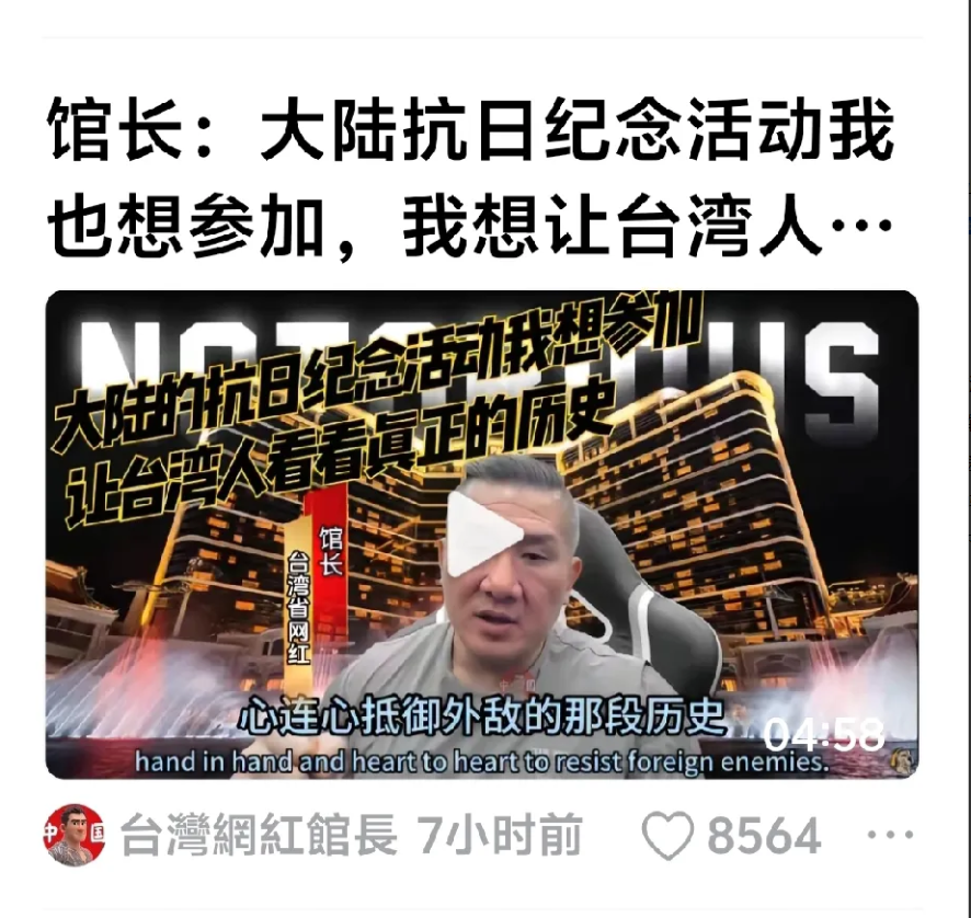 馆长何出此言? 馆长深知自己虽是个“网红”,但仅仅是个中国台湾的民间人士,如想要参加这次大陆官方举办的抗日纪念活动,是要通过大陆官方同意安排才可以。如果没有大陆官方邀请什么的,是进不了现场参加活动的。