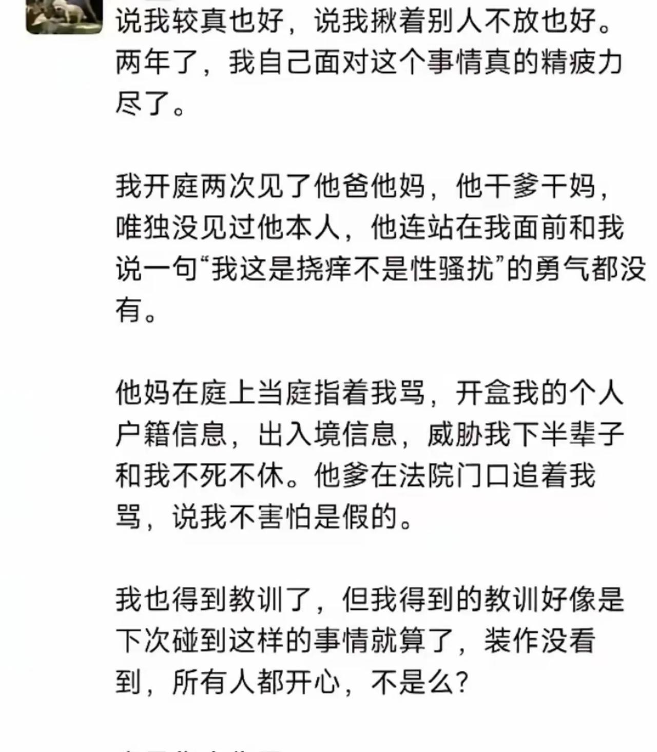 毁了肖同学前途的杨同学你没有愧疚感吗?据说全程肖同学都没有看过杨同学一眼,不知道这女的是怎么得出结论是性骚扰的!真是自以为是自作多情! 再说了,如果男的根本就没瞧自己一眼,正常情况下女孩子难道不应该是装着没看见立刻走开么(假如真的是在XSL),居然还特地偷偷摸摸地拍摄了70分钟的视频,这算是什么脑回路呢? 还有一点让我觉得细思极恐,就是一个人主观认为对方侵犯了自己权益,她不是诉诸法律让法律去判断和界定,而是通过制造舆论让对方“社死”,对对方造成了极大伤害,两年后,即使最后法律判定了肖同学的清白,也无法弥补给肖同学本人和其家庭造成的严重伤害,并且制造这种造成伤害的舆论者却没有受到法律制裁。当舆论代替了法律,对一个人及事自以为是地去判定,并对这个人作出惩罚,仿佛回到了未审就判、随意杀人的黑暗时代。 个人认为,这件事对杨同学来说并不是误会,而是她的机会!当她看到男生在挠下体时也许起初不知道在干什么,但很快在长达70分钟的观察和偷拍中清楚知道对方在干什么,于是她知道机会来了。她是学法的,从道歉信到网上曝光,一步步以受害者形象出现,不仅顺利毕业了,还作为优秀学生推荐读博。毕业后为了增加知名度扩大事情影响力,也为了练手提起了诉讼,还向法官提出了制定校园反性骚扰制度,这一系列操作是为了在后面的读博和就业中增加筹码,所以她很兴奋,她不在乎官司的输赢,她是想让别人看到她翻手为云覆手为雨的能力。 感觉杨同学是个妄想症患者,举报人家性骚扰?她看到什么了?肖同学在对面坐着,手放桌子下面,她钻桌子下面看了?从始至终肖同学都没有看她一眼,这算性骚扰吗?其实都是她自己的意淫,还死不承认。这下好了,两年前扔出去的回旋镖,最终又刺伤了自己。#武大性骚扰案# #性骚扰# #武汉性骚扰#