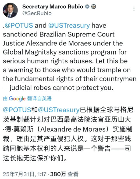 美国国务卿鲁比奥北京时间7月31日写道:“特朗普总统和美国财政部已根据全球马格尼茨基制裁计划对巴西最高法院法官亚历山大·德·莫赖斯实施制裁,理由是其严重侵犯人权。这对于那些践踏同胞基本权利的人来说是一个警告——司法长袍无法保护你们。”
