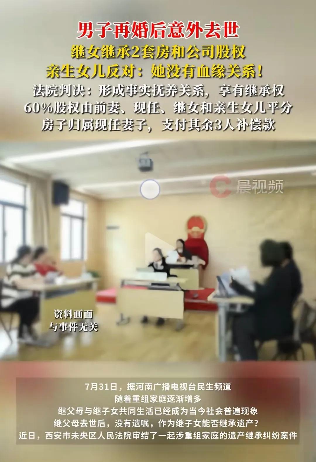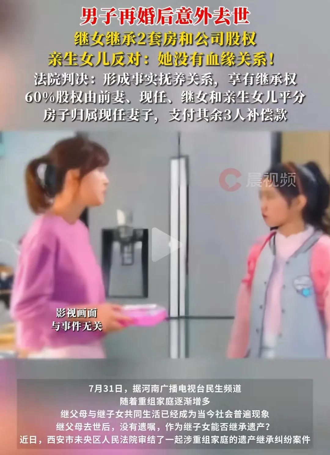 “三观尽毁!”男子再婚6年后意外去世,继女继承其2套房产和60%公司股权。男子亲生女儿跳出来反对:他们没有血缘关系!为此,双方闹上法庭,当庭唇枪舌战!只是没料到,法院判决令人意外! 7月31日,据媒体报道,近日,西安市某区人民法院审结了一起涉重组家庭的遗产继承纠纷案件。 2014年,女子李某带着12岁女儿改嫁,与男子张某重组家庭。 六年后,也就是2020年,张某意外去世,留下了2套房产和一家公司60%的股权。 其中,2套房产是李某和张某在婚姻存续期间购买的。 而张某的亲生女儿和前妻都认为,李某的女儿和张某没有血缘关系,不应该继承李某遗产。 所以张某亲生女儿一纸诉状,将父亲现任妻子和继女一起告上法庭,求他们归还父亲遗产! 法院审理认为:张某与继女形成事实抚养关系,享有继承权。 最终,法院判决张某现妻李某享有2套房子的所有权。按照当地市场行情支付给其余三人(前妻、亲生女、继女)折价补偿款。 而张某持有的60%公司股权由李某、李某的女儿(张某继女)、张某的亲生女儿和张某前妻四人各继承15%的份额。 看到这样的判决,简直就纳闷了!咋有种三观尽毁的感觉!还是这个世界太疯狂,正常人都跟不上节奏了! 有人反驳:在没有遗嘱的前提下,继妻有继承权没问题,但继子女不应该有;同理亲生子女必须享有继承权,但是前妻不应该有。 还有前段时间闹得沸沸扬扬的“娃哈哈遗产争夺战”到现在还没拉下帷幕。不知道新修的婚姻法到底是在保护谁? 去年还看到过一个报道,上海一86岁老头去世之后,有1套房产。结果冒出一个现任妻子都不认识的继子过来争夺继承权。 就因为这老头二婚娶过这位继子的妈,他们一起共同生活了四年,当时这个继子只有十岁,算是实际形成过抚养关系! 可笑的是,这老头和这位继子都快40年没联系了。但是在老头现任妻子去办理遗产继承时,这继子突然窜了出来,要继承遗产! 可悲的是,这从天而降的100多万,法院居然判这继子有继承权,而现任妻子的女儿却没有继承权。 要知道这老头生命后面的十几年,可都是现任妻子的女儿出钱出力在照顾,虽不是亲生,却胜似亲生。 记得报道里面现任妻子问过律师:如果老头在日时,要求这个继子赡养的话,继子应不应该养他? 律师回答应该赡养,但是老头在活着的时候没有主张,现在死了也就不能继续追责了。 但老头的房产确是和继子的母亲在婚姻存续期间购买的,当时继子也确实未成年,所以这个继子是享有遗产继承权的! 虽说现任妻子的女儿也算是老头的继女,但是他们结婚时,继女已经成年,不形成抚养关系,相对而言也就没有继承权! 我想说:就算继女没有继承权,那是不是要把这十几年来继女赡养老头的费用先扣掉,还给人家这总行吧!凭啥这继子躺赢?