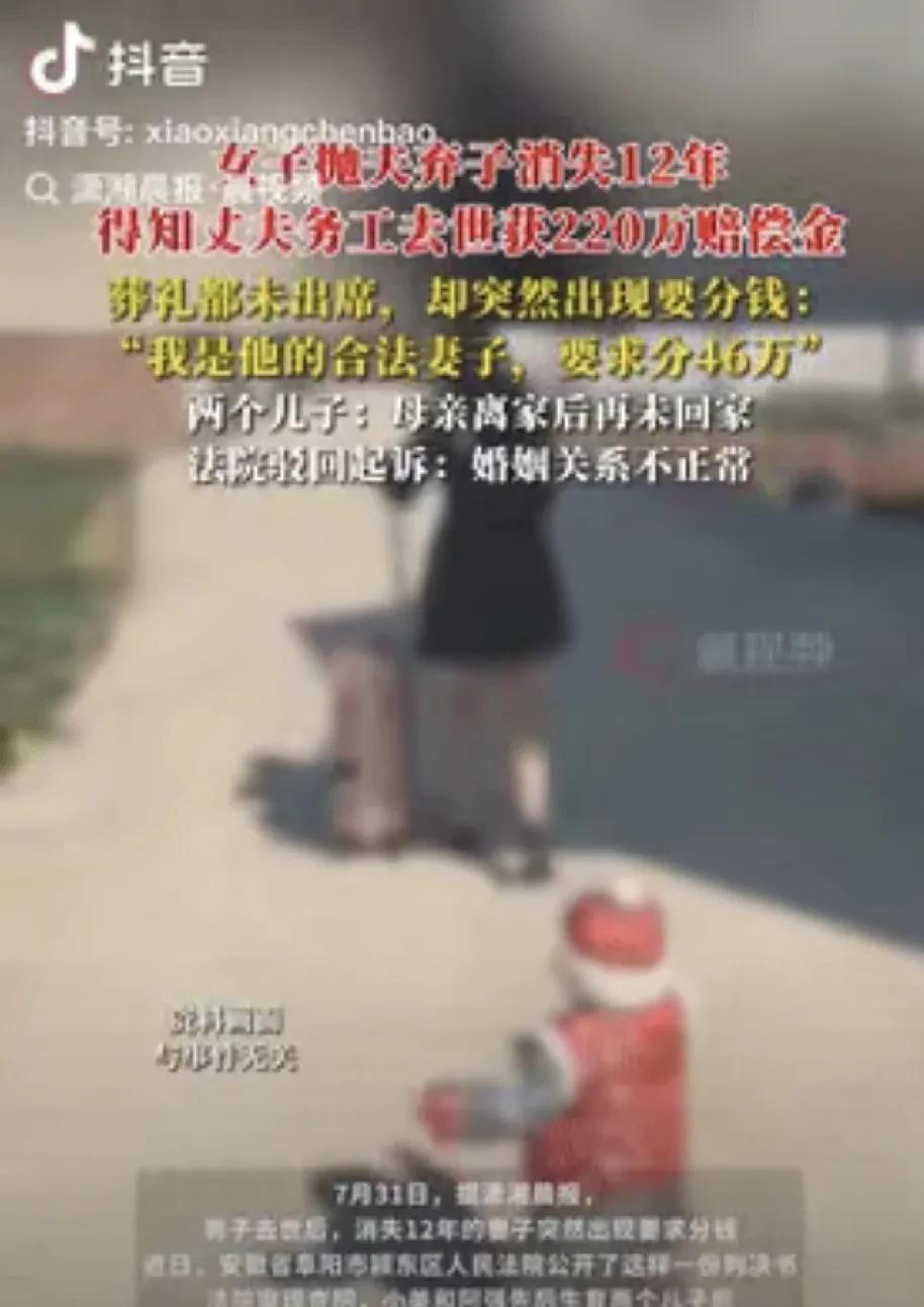 "要点脸吧[打脸]"!这是发生在安徽阜阳的一件事。一女子抛夫弃子消失12年,连丈夫去世时的葬礼都没有出席。但当他得知丈夫去世获赔220万的赔偿金时,却突然出现要求分钱,甚至将2个儿子告上法院,而法院的判决让女子大吃一惊。 【信息来源:潇湘晨报·晨视频】 这件事还得从13年前说起。当时女子和男子结婚后,一起生育了两个儿子。 就在大家以为日子就这么平安的过下去时,哪知道女子竟然无缘无故的抛夫弃子的走了,全然不顾苦苦哀求的丈夫和两个幼小的儿子。 那一年,两个孩子,一个7岁,一个5岁。 没有办法,男子只好又当爹又当妈的辛苦抚养两个幼子。 然而,麻绳专挑细处断。2022年,男子在外打工时,因意外不幸去世,单位赔偿了220万抚恤金。 就在男子家人给他举行葬礼时,女子都没有回来送其最后一程。 然而令人万万没有想到的是,当女子得知男子有220万元的赔偿金时,立马赶回来要求分一杯羹。 男子的父母自然不同意。他们质问女子:你都12年没有回来了,不说扶养老人了,就是母亲的职责不没有尽到义务,有什么资格来分得他儿子用命换来的钱? 女子不服气,于是去法院告他们。 法院受理案件后,经过调查,了解了女子的所作所为。 最后将赔偿判决如下: 2个儿子各拿30%。 女子一分都没有得到,她非常生气也非常失望。 这一幕也引发了网友的热议。 有的网友说:有些母亲没有母爱。 比如我妈离家出走的时候我16岁,我弟14岁。她一走我俩就不上学了,直到现在我俩都成家了,也都有自己的孩子了。两个孙子两个孙女,她也从来不闻不问,18年了我也不知道她在哪里。 有的网友说:这个当妈的太狠心了,能舍下亲生儿女。所以这么相信:父爱胜过母爱。父爱是世界上最无私,最伟大,最有担当的爱。 ………… 要我说啊,还好法院判的公平合理,真是一次有温度的判决。 那么对于这件事情,不知大家有什么想说的吗?大家见过这么狠毒的母亲吗?