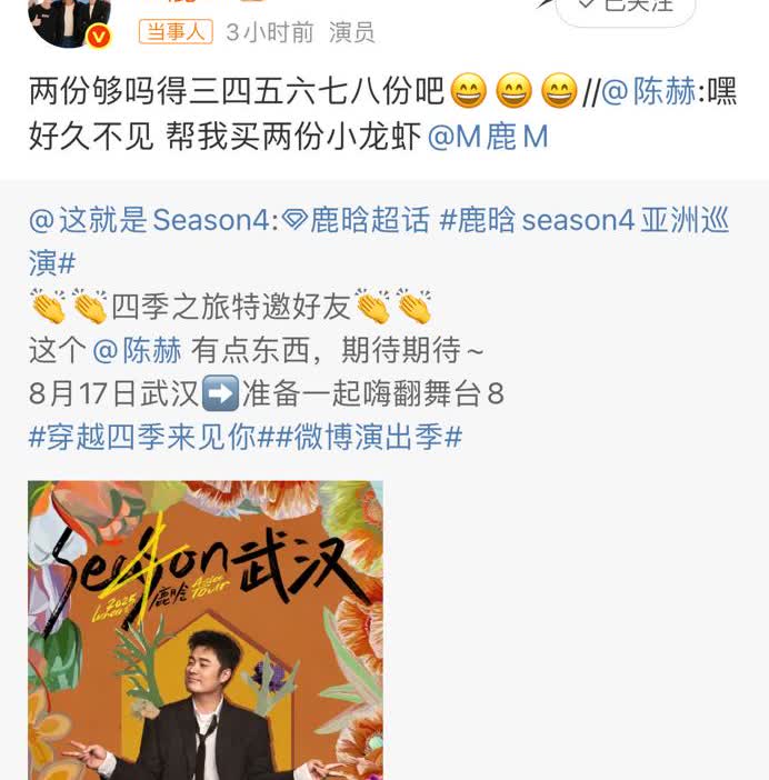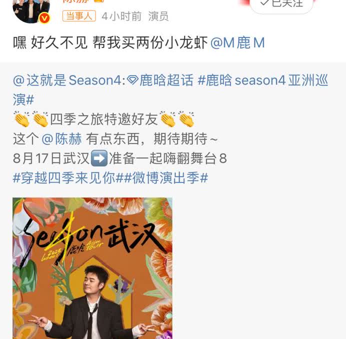 陈赫发微博让鹿晗帮买两份小龙虾! 原来是鹿晗工作室宣布陈赫为鹿晗演唱会武汉站特邀嘉宾, 陈赫转发的同时,提出代买小龙虾的请求,鹿晗迅速接梗反问:“两份够吗得三四五六七八份吧!” 两人互动间互怼及幽默尽显, 粉丝纷纷回忆“撕名牌吃小龙虾”的名场面, 还有人调侃陈赫:你要在演唱会上表演吃小龙虾吗?[偷笑][偷笑][偷笑]