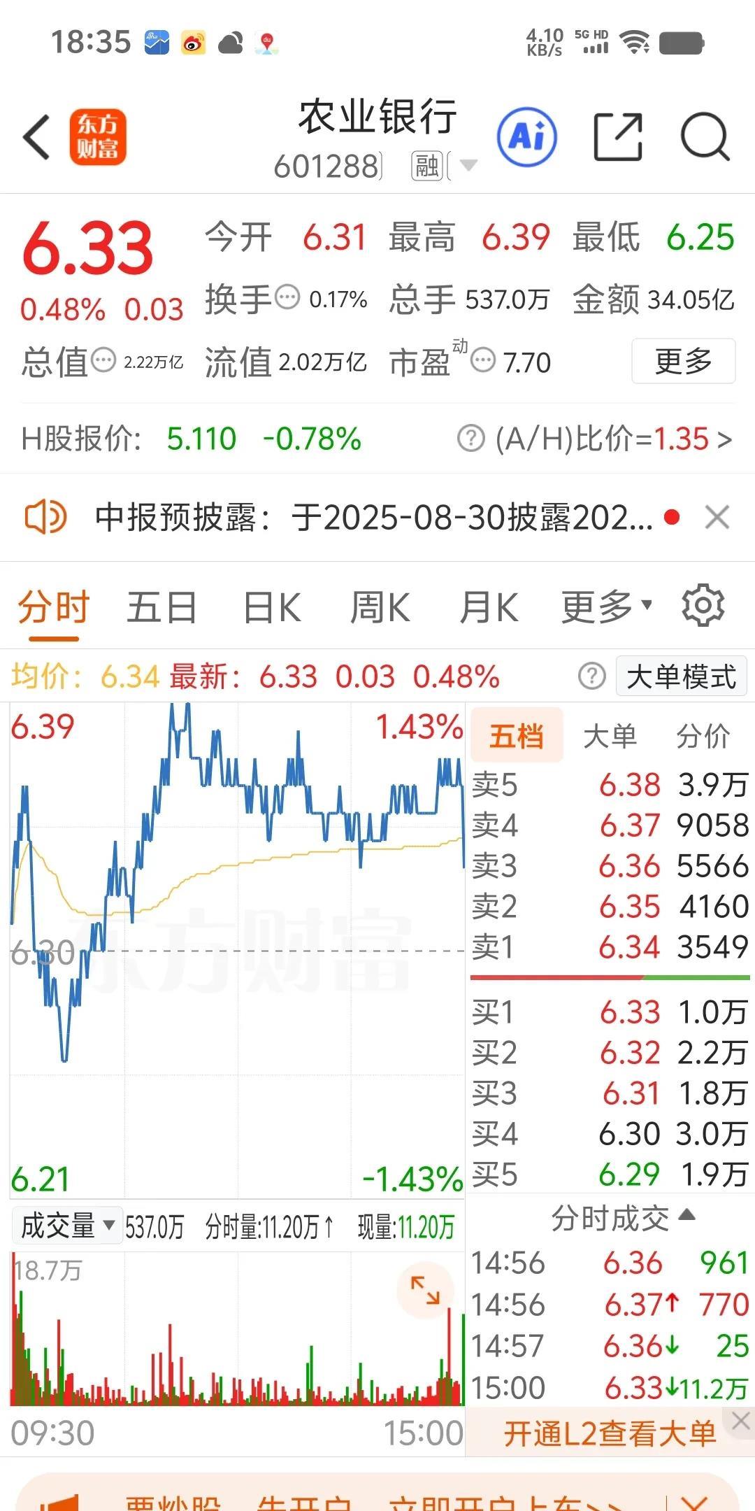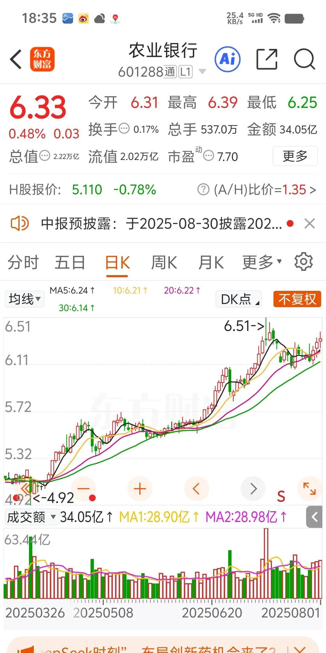 农行又创新高了。 这不会是农行最后一次创新高,后面只会一高更比一高高。 很多人不