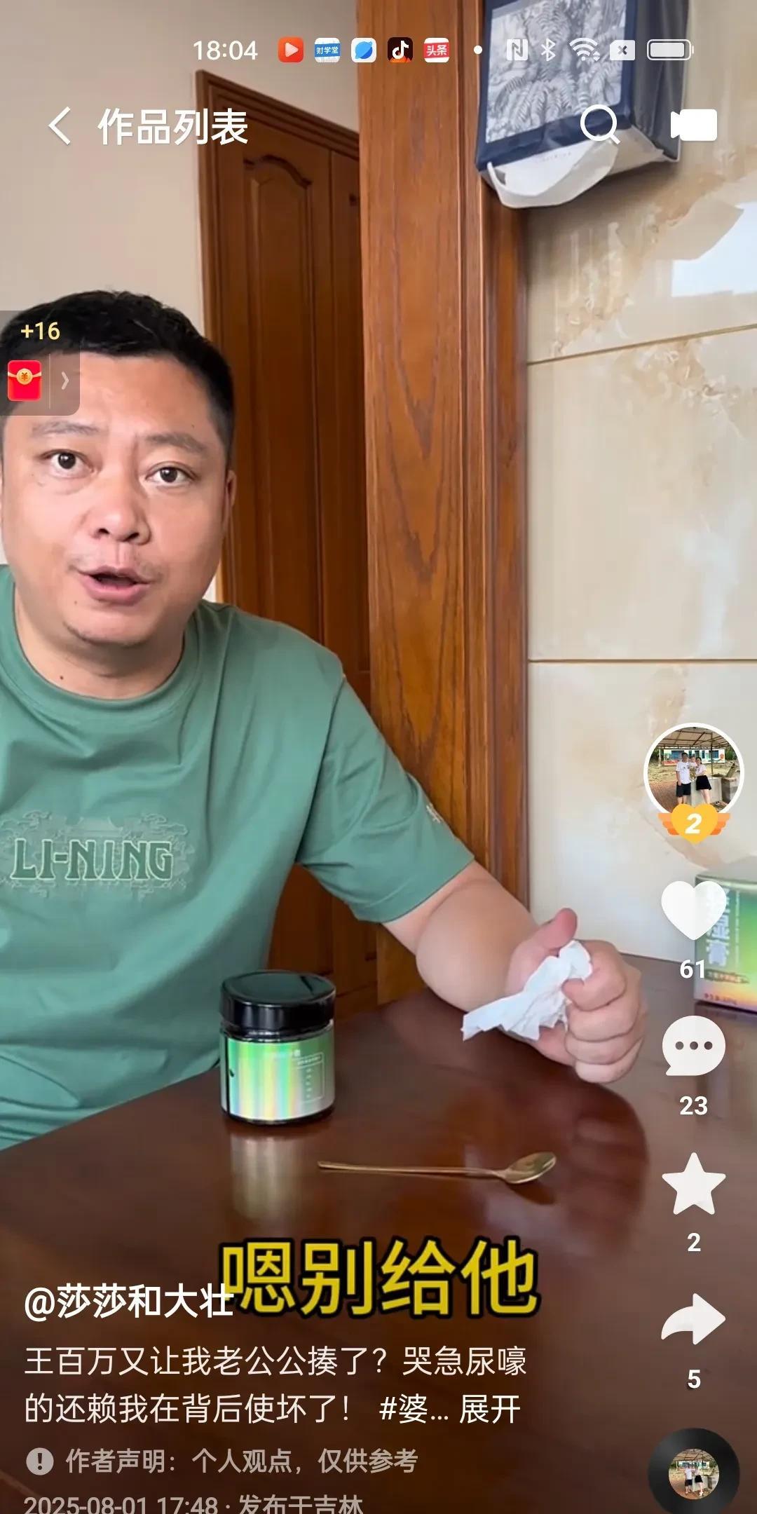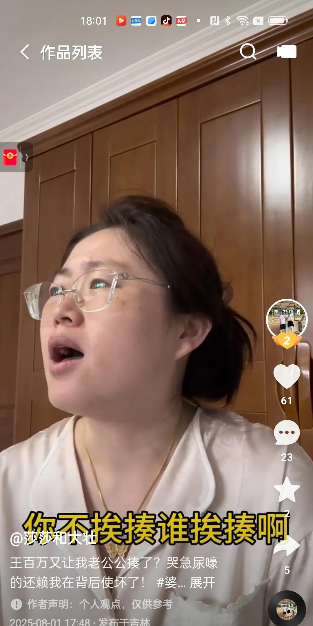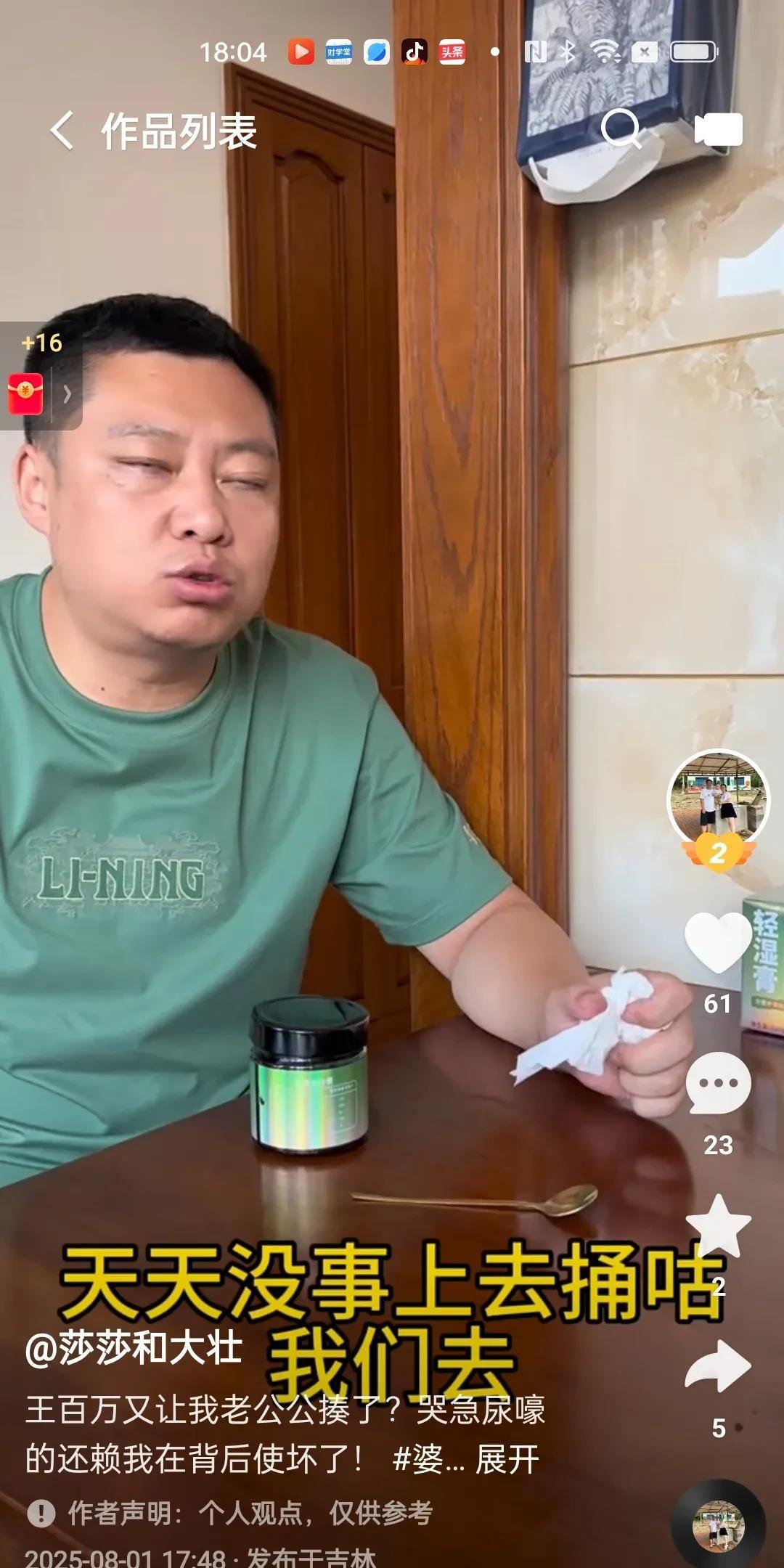 今天王百万给大壮打电话,又是哭又是嚎地骂莎莎,说莎莎撺掇大壮爸揍她。 莎莎问大壮:“你爸真揍你妈了?”大壮说揍没揍不清楚,不过撺掇大壮爸的不是莎莎而是大壮。大壮说那天修房子的时候,他说了一堆王百万的坏话,什么不让他们老赵家好,哪天去后山把大壮爷爷的坟给刨了之类的话,当时大壮爸特别生气。 昨天在路上王百万和大壮爸碰见了,大壮爸也没动手,只是拿眼睛瞪了王百万。 要说大壮爸揍王百万,大概率是王百万在撒谎。 昨天在直播间王百万就说,这事没完,明天要查个一清二楚。今天王百万果然去查了,也许先是问了奶奶,可能没问明白,就直接去问大壮爸了。大壮爸本来就一肚子火,王百万主动上门兴师问罪,正好撞枪口上了。 根据以往的经历,大壮爸一般不会主动打她,都是王百万不好好说话,惹得大壮爸生气。俩人话不投机就动手,大多数时候是王百万占上风,她虽然打了大壮爸,却会反咬一口,说自己被揍了。今天大壮没回去看,不过从大壮模棱两可的态度来看,王百万似乎没怎么样。要是大壮爸真把她揍了,她肯定不会善罢甘休,估计奶奶就会给大壮打电话了。上次王百万把大壮爸脑袋打破了,大壮去看的时候,王百万躺在炕上痛苦地呻吟,说大壮爸揍她了。大壮说:“不对呀,我爸脑袋都破了,你怎么还躺下了?”王百万马上坐起来喊道:“我要是不把他脑袋打破,挨打的就是我。”原来大壮爸就是想上去劝她回家,她以为是来打她的,没等大壮爸开口,她就把一个盛满米饭的大碗扔了过去,而且就是朝着脑袋扔的。 明天问问大壮爸就知道了,到底是谁打了谁?大壮爸要是有那本事,王百万能有今天?早就老老实实过日子了。