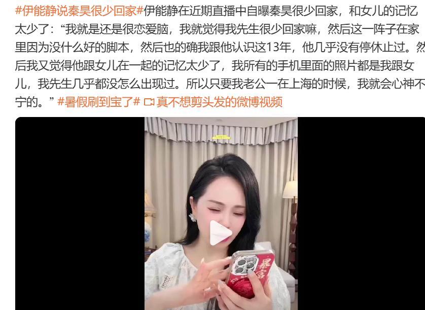 伊能静不装了 终于说实话了 直接吐槽秦昊很少回家,女儿的记忆中基本没有父亲了。 8月1日晚,伊能静在直播间里透露了真实的夫妻状态,她说:“我跟秦老师认识13年了,他几乎不会休息,一直都在外工作,很少回家,就我觉得,他跟女儿在一起的记忆太少了,我手机里全是母女的照片,他和女儿的照片就很少。” 说到这里,伊能静开始翻手机里的照片,翻了好久,终于找到了一张合照,还是在女儿生日的时候一起拍的。 给大家看完照片后,伊能静又接着说了自己的心态:“老公不在家气定神闲,老公在家就会心神不宁无心工作,我是恋爱脑。” 伊能静一直在说夫妻俩恩爱如初,可就她这一段发言来看,秦昊好似对家庭的依恋不太深。 换言之,两个人的感情也没有好到人人羡慕的程度。 这段话说完后,不出意外,伊能静又冲上了热搜,网友的评论也是五花八门。 有网友说:“秦昊回什么家,好好拍戏,中国电视剧需要他,舍小家为大家,这才是文艺工作者的典范。” 也有网友说:“秦昊真的没多爱他,属于自由状态,伊能静自己沉浸,自导自演。” 目前夫妻俩的工作情况也发生了变化,以前是伊能静在外拍戏赚钱,秦昊待业在家;现在伊能静无戏可拍,只能在家搞直播,相反秦昊的事业迎来高峰期,爆款剧一部接着一部。 伊能静是恋爱脑,但秦昊不是,他这几年在娱乐圈势如破竹,节节胜利,当然要一鼓作气,趁着热度再多拍几部,争取拿下来年视帝的奖项。 或许,这也是他不回家的真正原因。你说是不是?