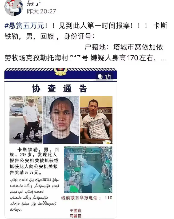 7月29日晚间,塔城的一位警察在社交平台上发文,呼吁见到此人后第一时间报案,并详细描述了嫌疑人的特征:嫌疑人名叫卡斯铁勒,男,回族,户籍地为塔城市窝依加依劳牧场克孜勒托海村127号,身高约170厘米,体型偏瘦,卷发且头发较短,络腮胡,左侧手背和手臂有纹身,右侧手臂内侧有大写字母N的图案纹身,左手手臂内侧有自残遗留的陈旧性割伤。