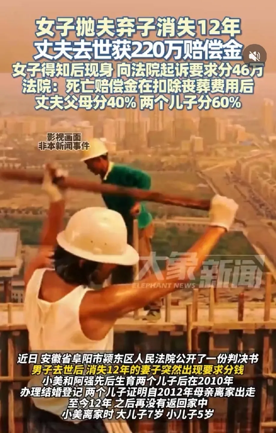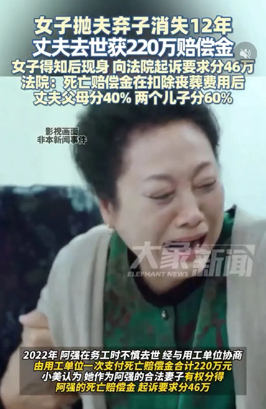 安徽阜阳,男子意外去世获赔220万赔偿金,消失12年的妻子突然跳出来要分走46万的赔偿金。两个儿子都不同意,母亲离家出走这么多年,父亲的葬礼都没有出席,现在凭什么分钱?妻子以合法夫妻的身份闹上法庭,法院这样判!
