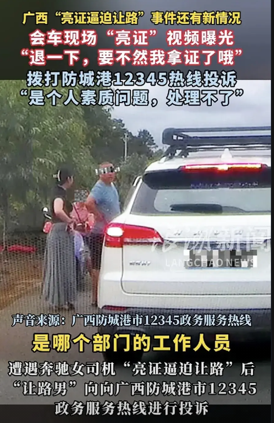 要不然我就拿证了哦! 广西防城奔驰女车主真的拿证了。 视频我也看了,视频车主都打方向避让,并和对方说大家避让下就可以过了。但奔驰就是纹丝不动。 图片可以看到,视频车后面是还有车跟着的,奔驰车没有,她有大的空间退后或靠边。 不过最后拿证出来的奔驰女还是自己挪车避让,双方通过。 就是嘛!会车时双方驾驶员应该互相礼让,哪会有那么多的堵车。 但现在,网友们不是关注她不避让会车的事情。 而是关注她是谁,亮的是什么证。还有就是她为什么会在现场,那么快就可以查到视频车主的姓氏和住址。和派出所民警上门要求删帖,要求向奔驰女道歉的几个问题。 警方已发通报,现已成立工作组展开调查。相信很快就会调查清楚。