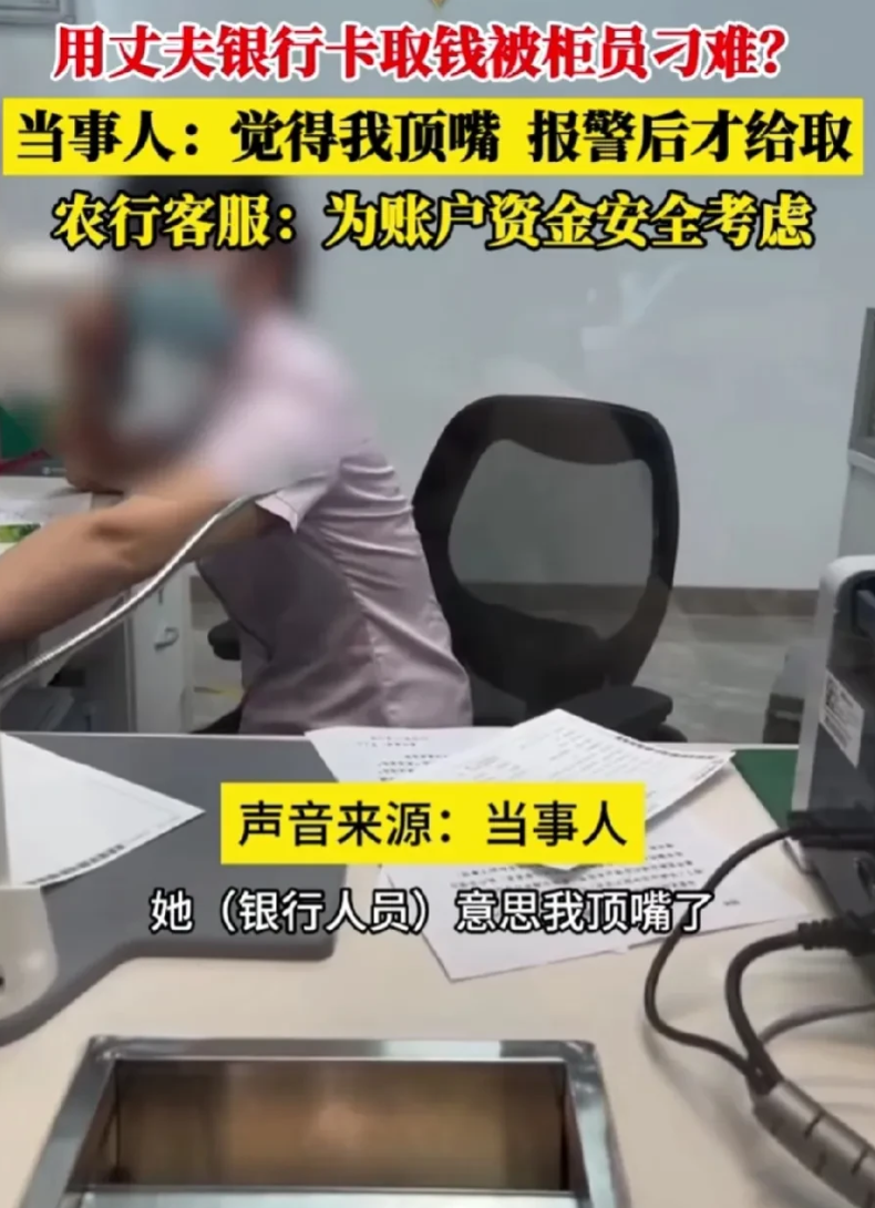 她怎么也没想到,明明自己有本人身份证,还有丈夫的身份证,是可以代理取的。 但是她却遭到了刁难,还引起了一场冲突,这让李娟心情烦躁不安。 事发当天,她去银行取钱,工作人员得知李娟是代领的,于是给她一份防诈骗通知书,让她看完就签字。 等李娟签完事后,她以为就可以取钱了。 可是银行的工作流程才刚刚开始。 银行又对她说,要打电话给银行卡的本人核实情况。 李娟无奈,也只能干着急地报了丈夫的号码。