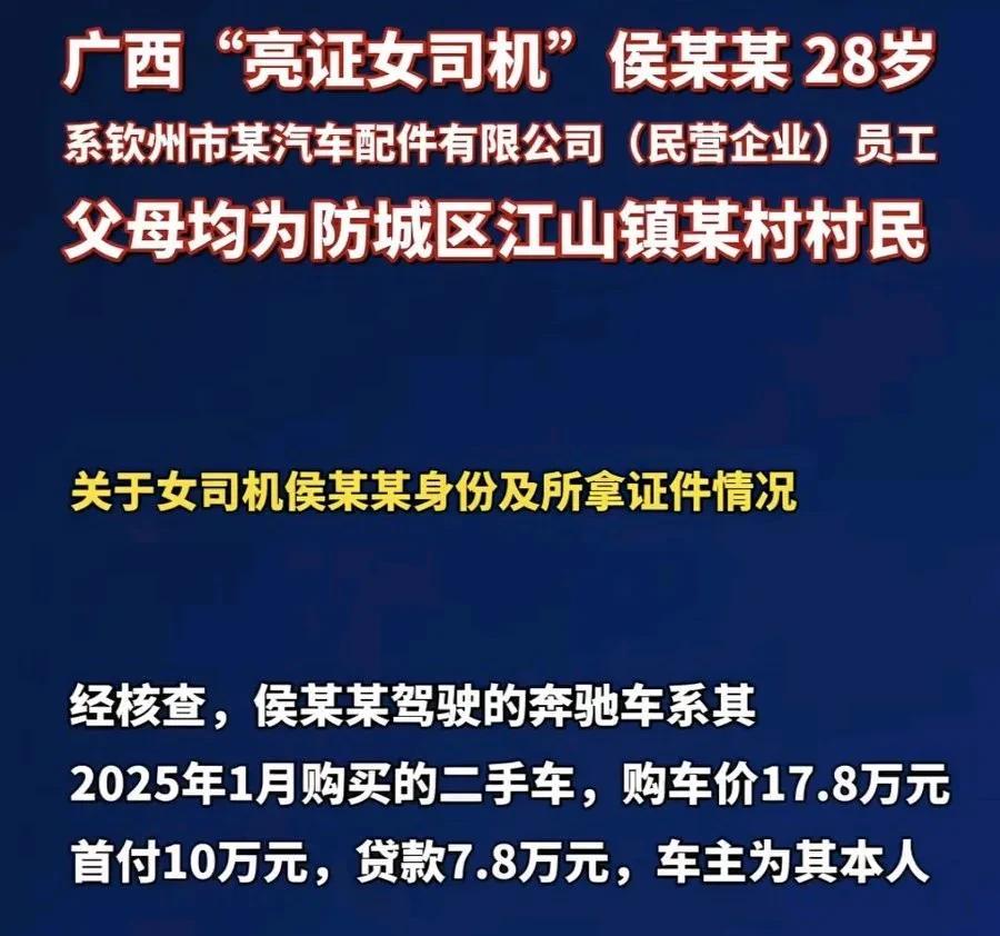 解释清楚了,亮姐姓侯,才28岁,买的二手奔驰车17.8w还要贷7.8。跟白车司机