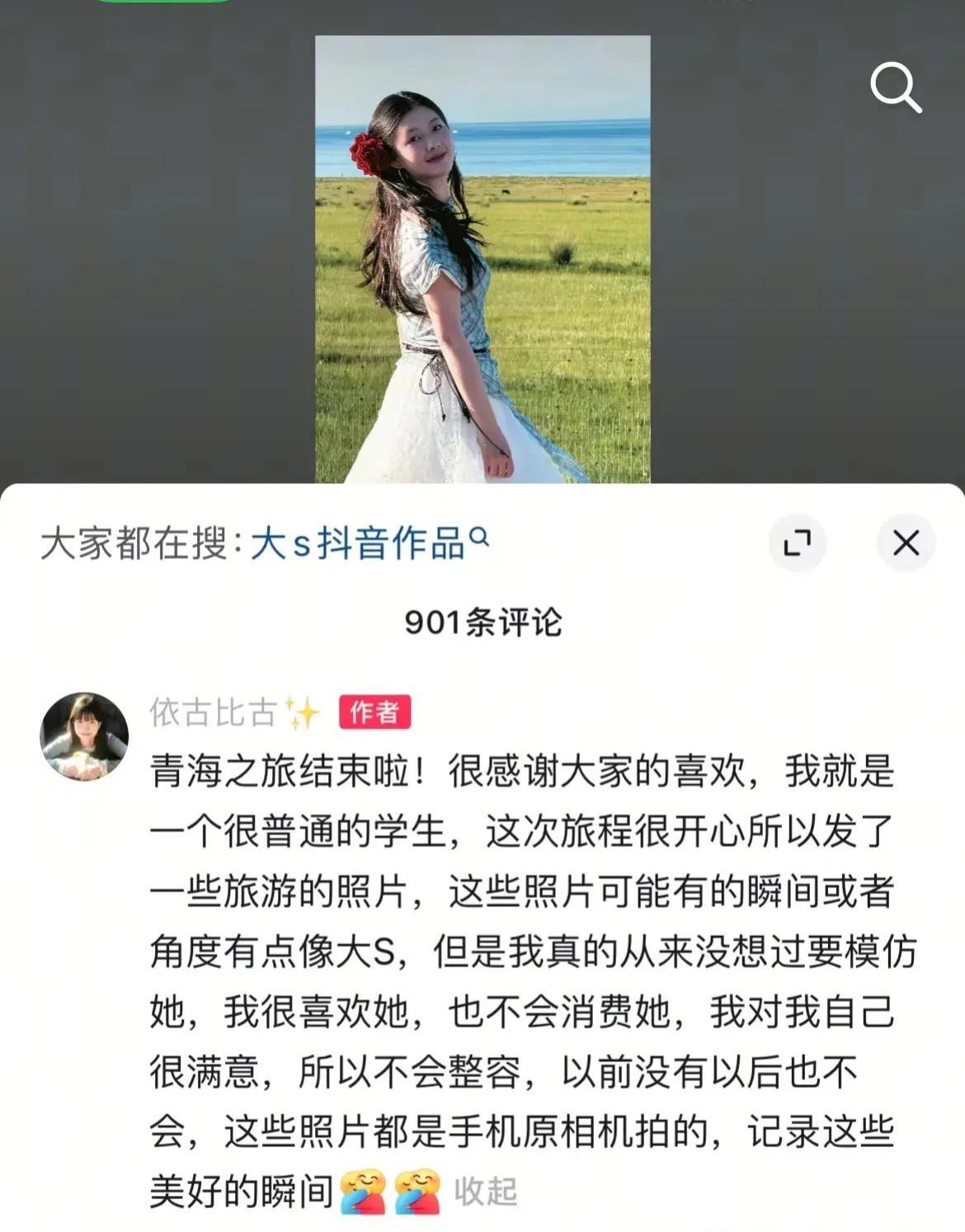 很想给s妈打个电话, 跟她老人家讲一下, 要是实在想念大s且一直无法释怀的话, 可以去痘印看依古比古的视频作品, 网友说有个比中s还像大s的人出现了, 也许这是大s冥冥之中的安排, 能让s妈减轻痛苦,多一些慰藉呢! 两个孩子也能够看到妈妈年轻时的模样! 网友调侃:汪小菲说不定晚上也会偷偷地刷刷依古比古的视频吧[笑哭] #我的宝藏兴趣#