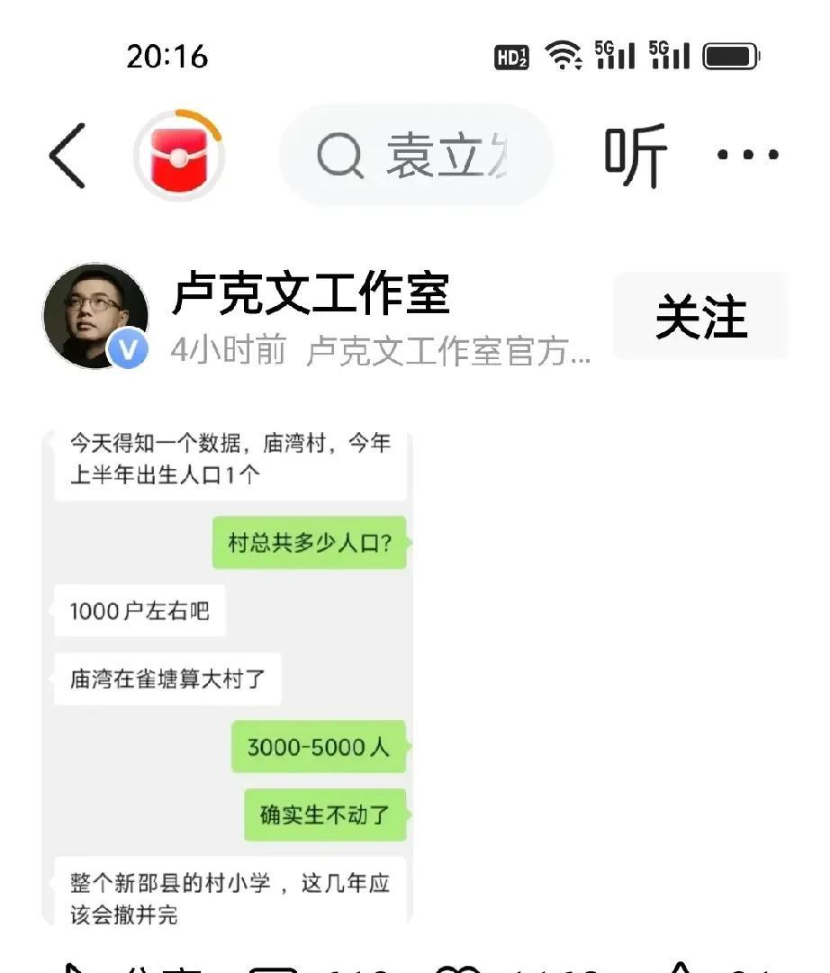 湖南新邵县雀塘镇庙湾村,有1000户人家,在南方也算大村了,上半年出生1个孩子。按建档,下半年还将有1个孩子出生。 这是湖南自媒体大咖卢克文转载确认的。 只能说人口出生率比预想的下滑还严重。 现代国人的压力实在是太大了, 养娃不易,接下来看一年3600元育儿补贴, 到底对人口出生率回升能有多少拉动作用了。 #头号创作者激励计划#
