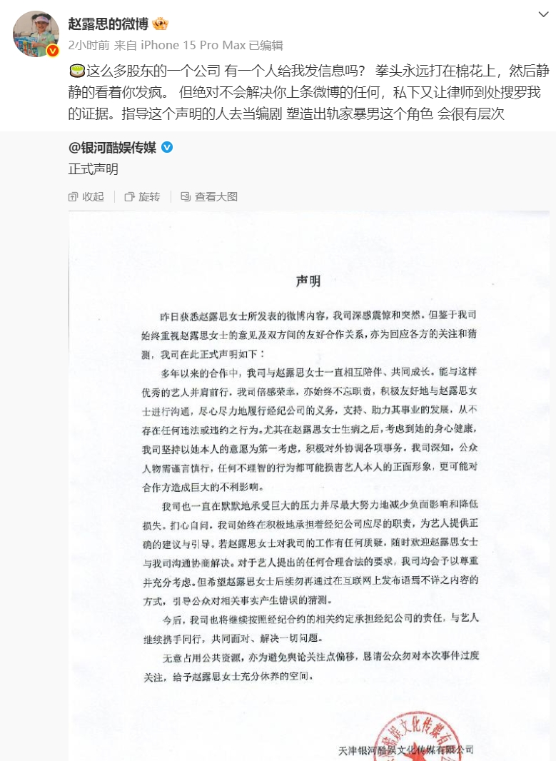 她质问这么多股东的公司,怎么没人给她发消息,银河酷娱第一大股东是阿里巴巴,第二大股东是优酷,赵露思如果不妥协,职业生涯基本就结束了,当然,一开始和赵露思签约的团队并不是现在的股东,优酷这边还把《恋人》送审了,如果顺利播出,会将损失降到最低,银河酷娱和赵露思也能少赔点钱。