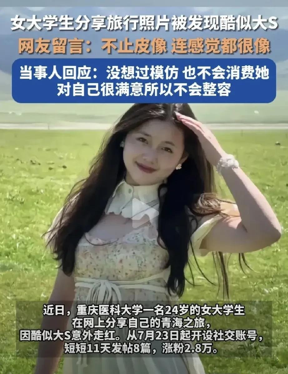 这个长相酷似大S的24岁女大学生,我觉得她接下来有3条路可供她挑选: 第一条:短短几天,她凭借一张清水出芙蓉的照片收获了将近3万粉丝,后面肯定还会有很多很多……然后自然而然她就可以直播带货了。 第二条:吸引星探来签约她,极有可能往娱乐圈发展。 第三条:极有可能汪小菲和具俊烨会帮助她。 说真的,这个女孩你看她笑的时候,眼里那股劲儿,比那些磨皮磨到脸都平了的网红脸好看多了。 我认为敢素颜、敢大笑的女孩,活力四射的,本身就很美。 不过话说回来,如果我是这个女孩,我不喜欢别人说我像大S,毕竟人家是红颜多薄命[尬笑]! 大家说我说的有没有道理?#头号创作者激励计划#