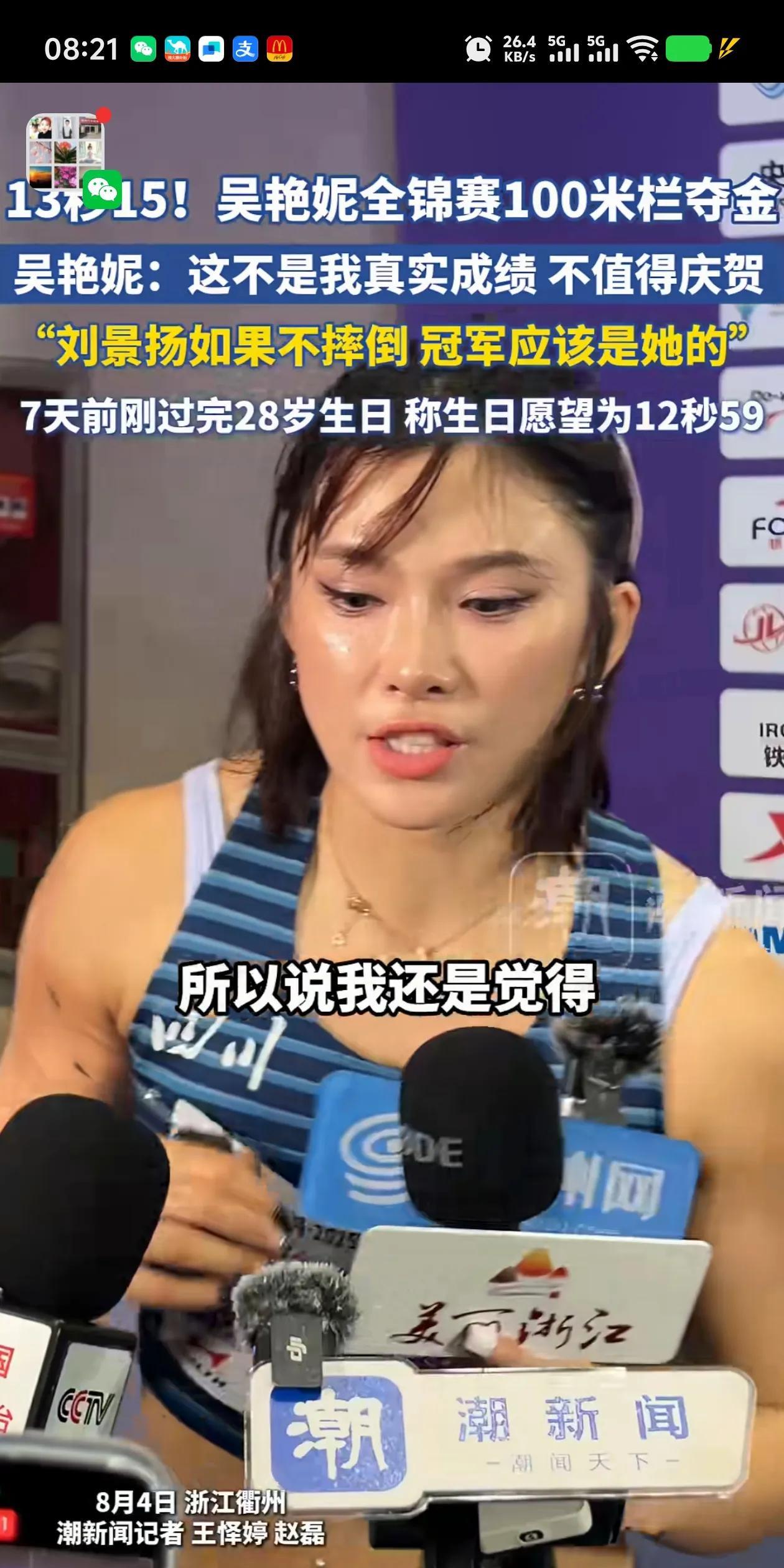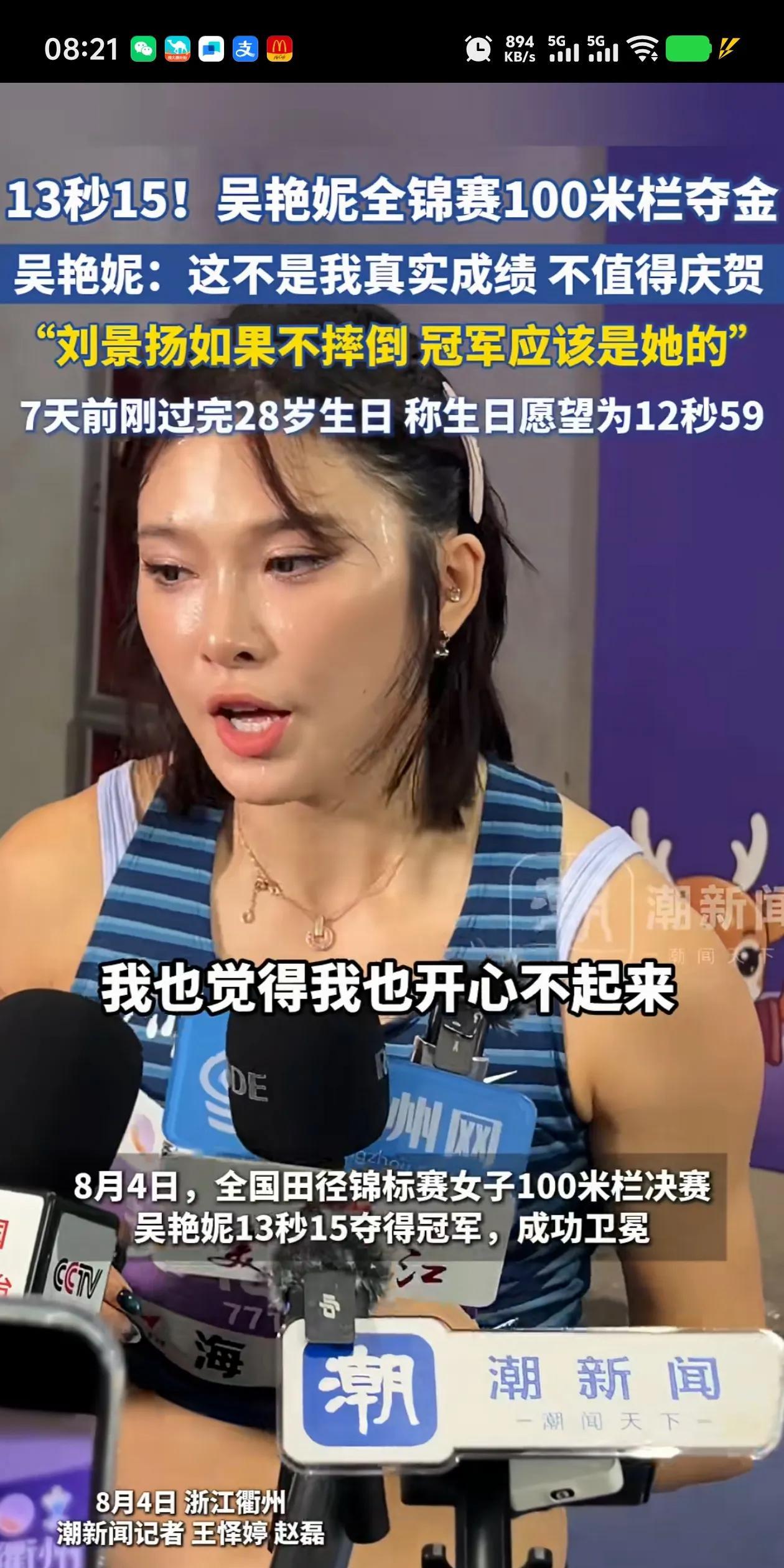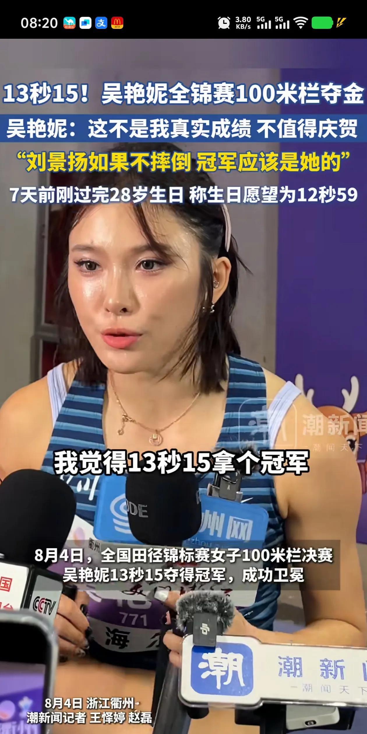 今天看她采访觉的是个好运动员,直性子非常坦诚,祝你下一次跑出自己理想的成绩,今天吴艳妮很好,说出了大实话,13秒15成绩太差了。