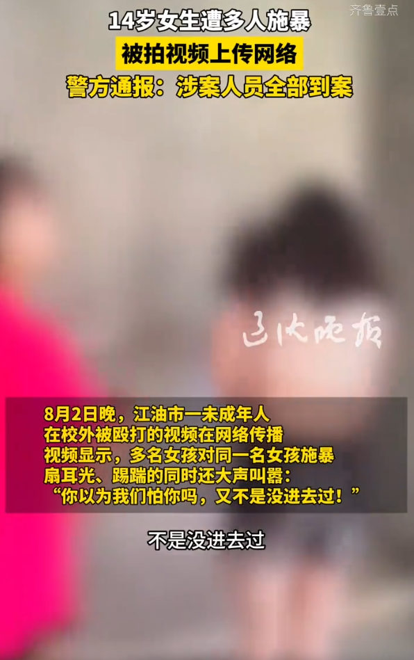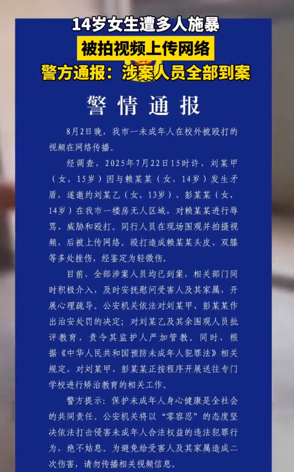 信息来源:2025-08-04 ·齐鲁壹点《14岁女生遭多人施暴,被拍视频上传网络,警方通报:涉案人员全部到案》