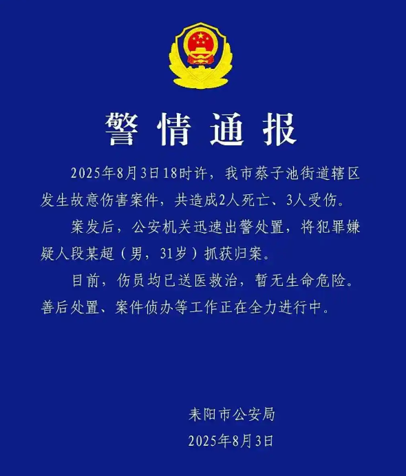 当晚9时40分左右,耒阳市公安局发布警情通报,正式回应此事。通报证实,8月3日18时许,蔡子池街道辖区确实发生了一起故意伤害案,案件共造成2人死亡,3人受伤。通报还透露,31岁的犯罪嫌疑人段某超已被警方抓获归案。目前,伤员均已送医救治,暂无生命危险。善后处置和案件侦办等工作正在全力进行中,但通报未披露凶手伤人的具体原因。